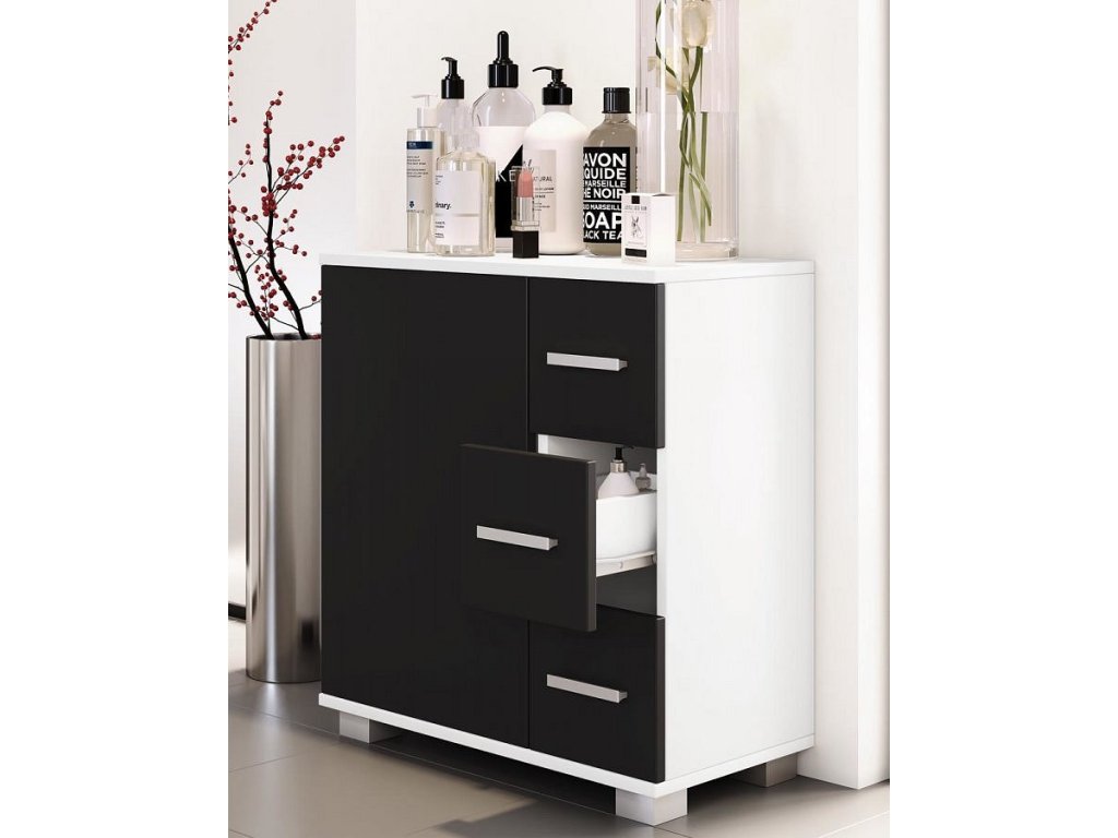 Koupelnová skříň VCM Zalo XL je praktická a stylová skříň do koupelny, která díky svému nadčasovému designu doplní každý interiér. Tato koupelnová skříň nabízí tři zásuvky, velká otočná dvířka a dva přehledné přihrádky, což poskytuje dostatek prostoru pro uložení kosmetiky, hygienických potřeb či textilu. Melaminový povrch je snadno omyvatelný a odolný proti vlhkosti, takže je skříňka ideální jako funkční a dlouhodobě odolný nábytek do koupelny.