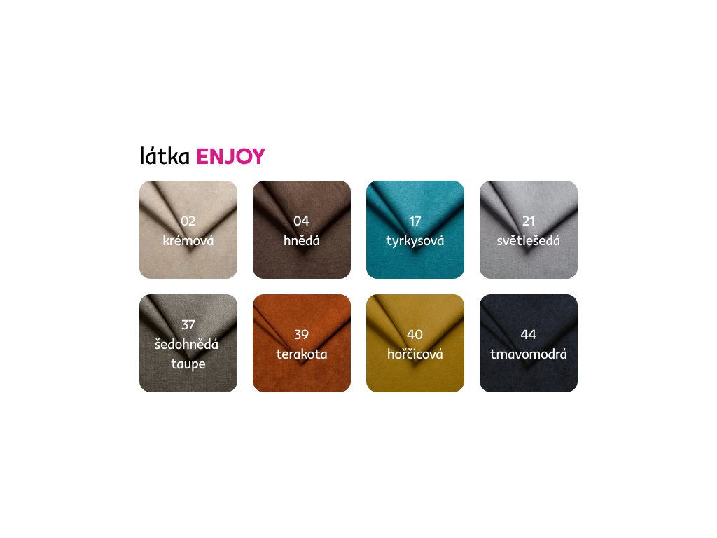Možnost objednání v 8 barevných provedeních látky Enjoy v ceně 6.390 Kč. Při individuální objednávce je třeba zaplatit 20% zálohu z dané částky. Po uhrazení zálohy bude Váš požadavek zadán do výroby. Dodací lhůta 6-8 týdnů.