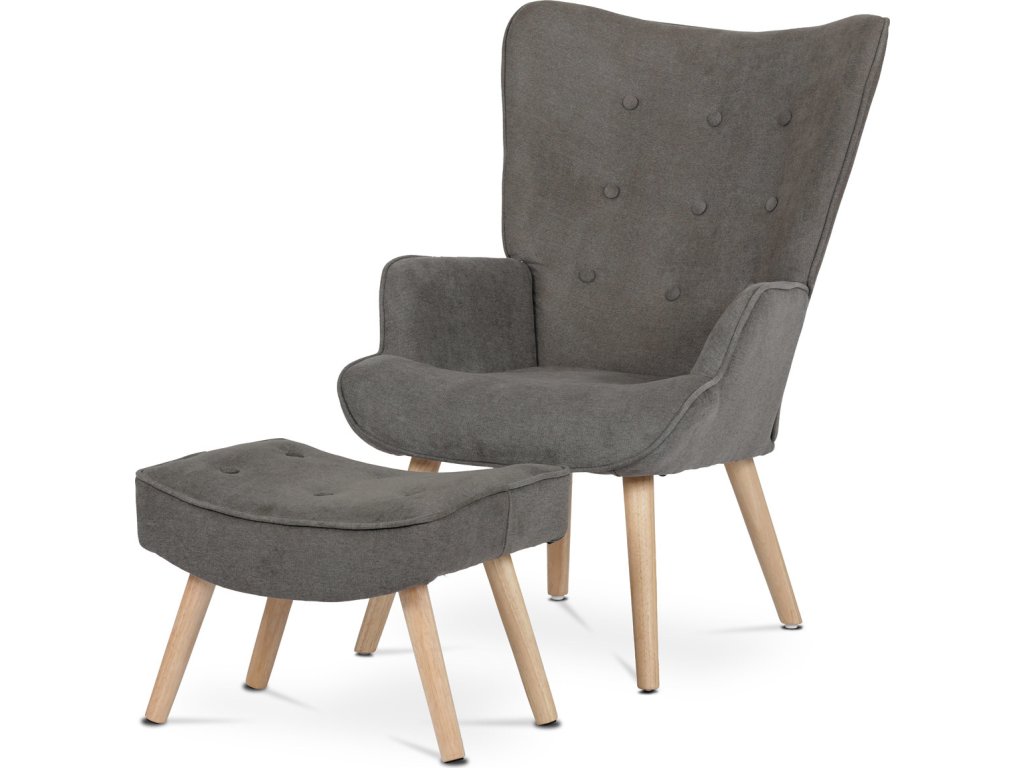 Křeslo "ušák" s podnožkou, potah hnědá látka, dřevěné nohy, masiv kaučukovník AK-302 LAN2