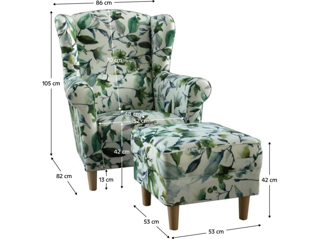 Pohodlné křeslo ušák ASTRID s taburetem je oblíbeným kusem nábytku, který skvěle doplní Vaši odpočinkovou zónu. Křeslo má dřevěné nožky v přírodním dekoru a je potaženo kvalitní látkou se vzorem zeleného listí. Křeslo nabízíme v několika odstínech, takže si určitě vyberete to, které se bude nejvíce hodit do Vašeho pokoje.