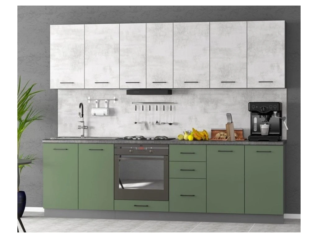 Stylová kuchyňská sestava je efektivním a cenově dostupným řešením pro každou kuchyni. Díky rozměru 260 cm poskytuje dostatek úložného prostoru, je vyrobena z kvalitní LTD desky a barevný beton kuchyně je v barvě grafit.