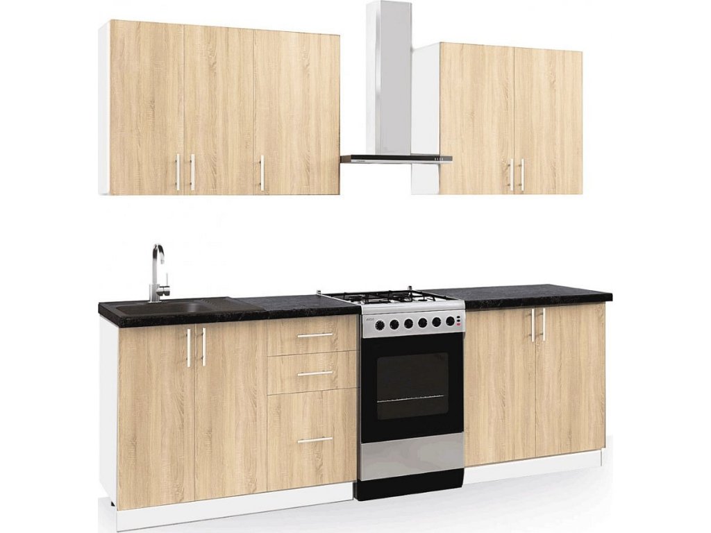 CASA 19007 Tato moderní kuchyně kombinuje praktičnost a jednoduchý design. Skříňky se dají poskládat v libovolném pořadí a to Vám umožní si sestavit kuchyni podle svých představ. Korpus a sokl jsou z kvalitní LTD desky v barvě bílé, dvířka jsou v barvě dub sonoma. Úchyty jsou stříbrné plastové.