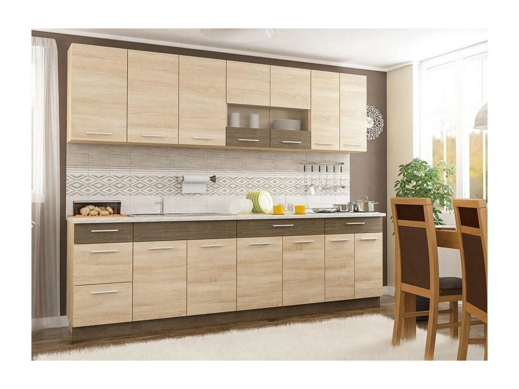 CASA 97016 Kuchyně v moderním stylu. Tato kuchyně je navržena tak, že skříňky se dají poskládat v libovolném pořadí. To vám umožní si sestavit kuchyni podle svých představ. Korpus, sokl i dvířka jsou z kvalitní LTD desky v barevné kombinaci dub sonoma/dub truffle. Úchyty jsou kovové.