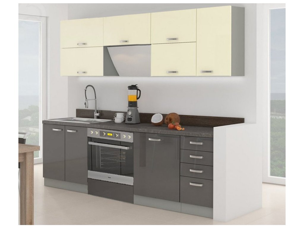 CASA 87001 Moderní a levná kuchyně. Tato kuchyně je navržena tak, že skříňky se dají poskládat v libovolném pořadí, popřípadě další doobjednat. To vám umožní si sestavit kuchyni podle svých představ. Korpus i sokl jsou šedé barvy, dvířka vyrobená z MDF v lesku jsou v barvě šedá v kombinaci s krémovou. Pracovní deska není v ceně. Spotřebiče, dřez a digestoř v ceně nejsou.