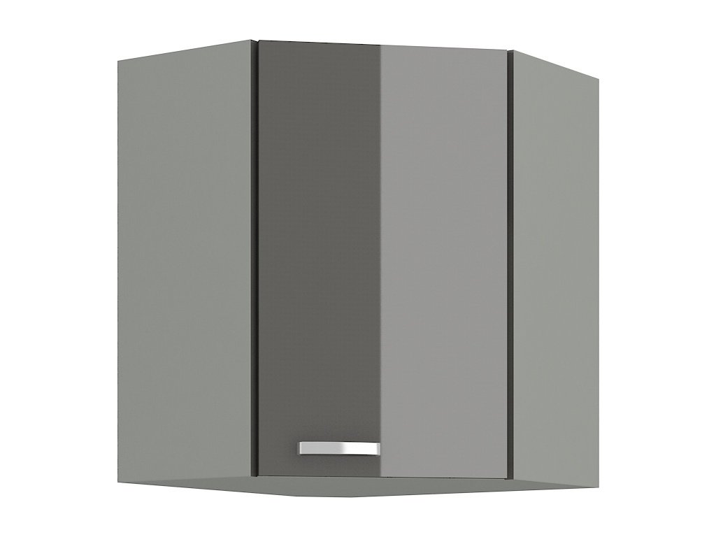 CASA 87001 Horní skříňka rohová GREY vyrobená z kvalitního lamina a MDF. Korpus je v barvě šedá a dvířka v barvě grey šedá v lesku. Rozměry skříňky - šířka 59 x 59 cm, výška 71,5 cm, hloubka 31 cm. Úchyty jsou z kovu. Dvířka mají pravé otvírání. V naší nabídce naleznete další výběr skříněk k sestavení celé kuchyně.