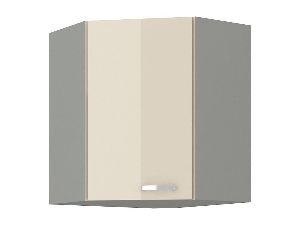 CASA 87001 Horní skříňka rohová KARMEN vyrobená z kvalitního lamina a MDF. Korpus je v barvě šedá a dvířka v barvě karmen krémová v lesku. Rozměry skříňky - šířka 59 x 59 cm, výška 71,5 cm, hloubka 31 cm. Úchyty jsou z kovu. Dvířka mají levé otvírání. V naší nabídce naleznete další výběr skříněk k sestavení celé kuchyně.