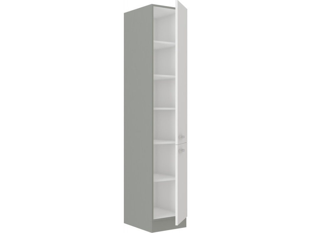 Vysoká kuchyňská skříň je vyrobena z lamina tloušťky 16 mm bílé lesklé barvy a bude dalším krásným kouskem z této kuchyňské série. Korpus skříňky je v šedém provedení. Uvnitř skříně najdete pět praktických polic k uložení všeho co v kuchyni potřebujete uskladnit. Na dvířkách jsou kovové úchytky (délka 135mm) a dveře jsou vybaveny systémem tichého zavírání. Skříňka je vyrobena z kvalitních MDF desek. Poskládejte si z naší bohaté nabídky skříněk moderní a designovou kuchyň podle Vašich představ. V doplňkových fotografiích najdete pro inspiraci fotky kuchyní, které jsou z těchto skříněk sestaveny. Skříňka je dodávaná v demontu. Součástí je montážní plánek včetně všech potřebných spojovacích materiálů.