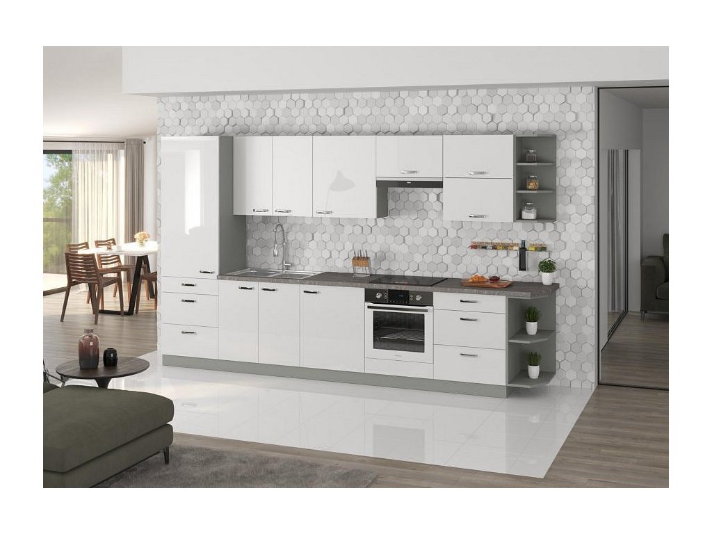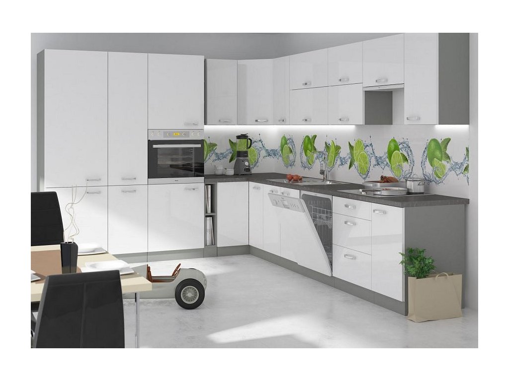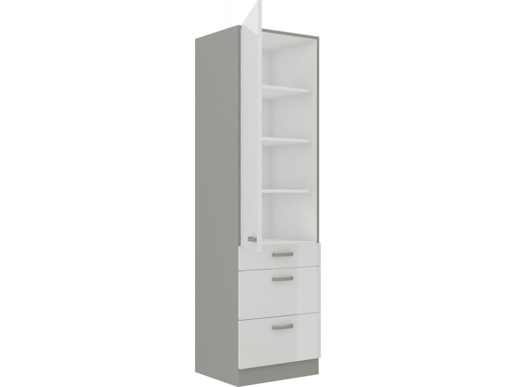Velice praktická a dostatek místa poskytující vysoká kuchyňská skříň je vyrobena z lamina tloušťky 16 mm bílé lesklé barvy a je tak dalším krásným kouskem z této kuchyňské série. Korpus skříňky je v šedém provedení. Skříňka je rozdělená na dvě části. Horní část se skládá ze tří praktických polic. Spodní část skříně je tvořena šuplíky. Jeden nižší a dva vyšší šuplíky pro praktické uskladnění všeho co v kuchyni potřebujete. Na dvířkách jsou kovové úchytky (délka 135mm) a dveře jsou také vybaveny systémem tichého zavírání. Skříňka je vyrobena z kvalitních MDF desek. Poskládejte si z naší bohaté nabídky skříněk moderní a designovou kuchyň podle Vašich představ. Skříňka je dodávaná v demontu. Součástí je montážní plánek včetně všech potřebných spojovacích materiálů.