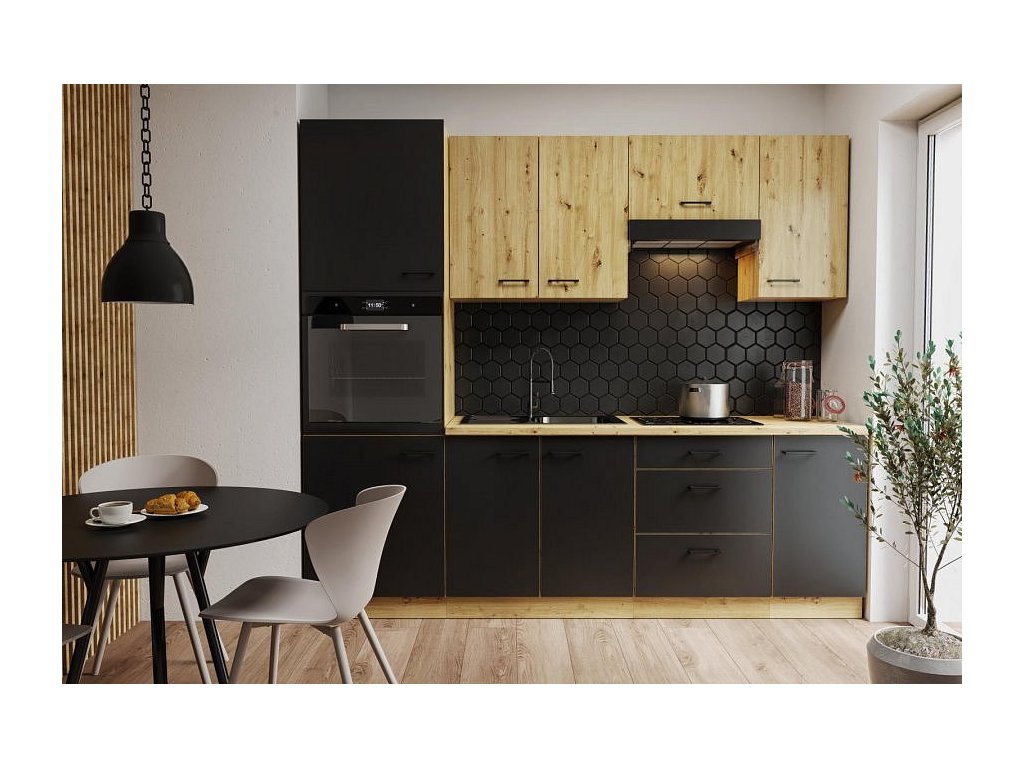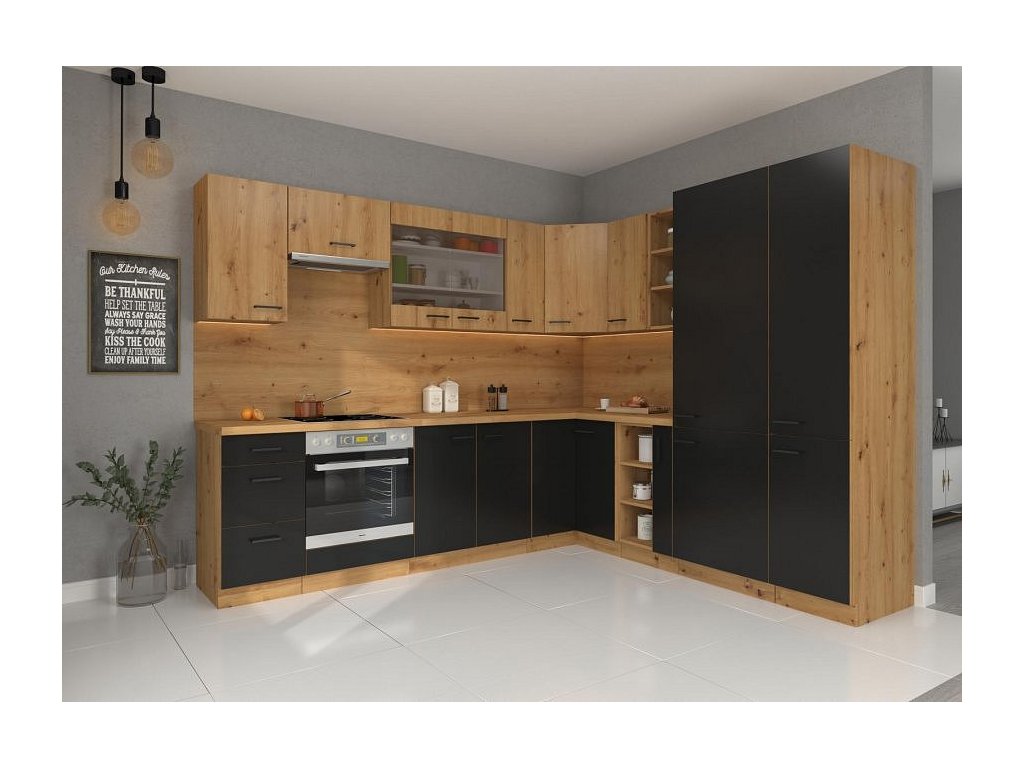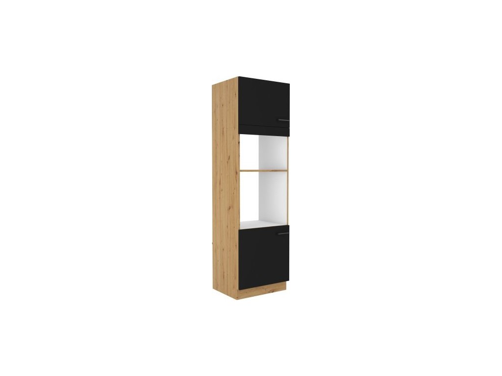 Vysoká kuchyňská skříň je určena pro vestavěnou mikrovlnou troubu a vestavěnou troubu. Vrchní skříňka nad skříní má zabudovanou jednu polici. Skříň je vyrobena z lamina tloušťky 16 mm černé barvy a bude dalším krásným kouskem ve Vaší kuchyňské sérii. Korpus skříňky je v provedení dub artisan. Na dvířkách jsou černé plastové úchytky délky 136 mm a lze je namontovat horizontálně nebo vertikálně. Dveře jsou vybaveny systémem tichého zavírání. Skříňka je vyrobena z kvalitních MDF desek. Poskládejte si z naší bohaté nabídky skříněk moderní a designovou kuchyň podle Vašich představ. Skříňka je dodávaná v demontu. Součástí je montážní plánek včetně všech potřebných spojovacích materiálů.