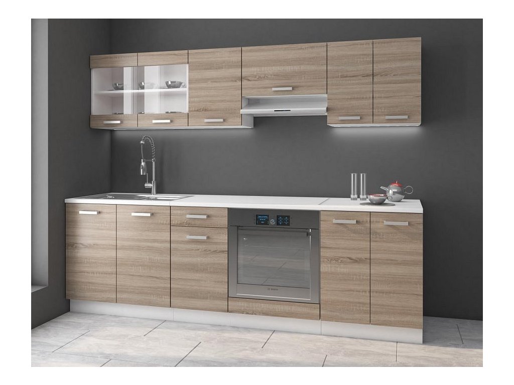 Zboží je dodáváno v demontu, součástí je montážní plánek včetně všech potřebných spojovacích materiálů. Vyobrazené spotřebiče, dřez, baterie a dekorace nejsou v ceně.