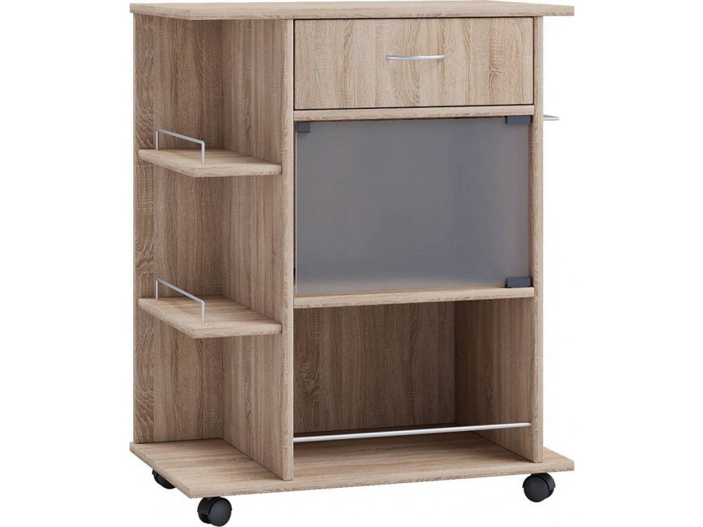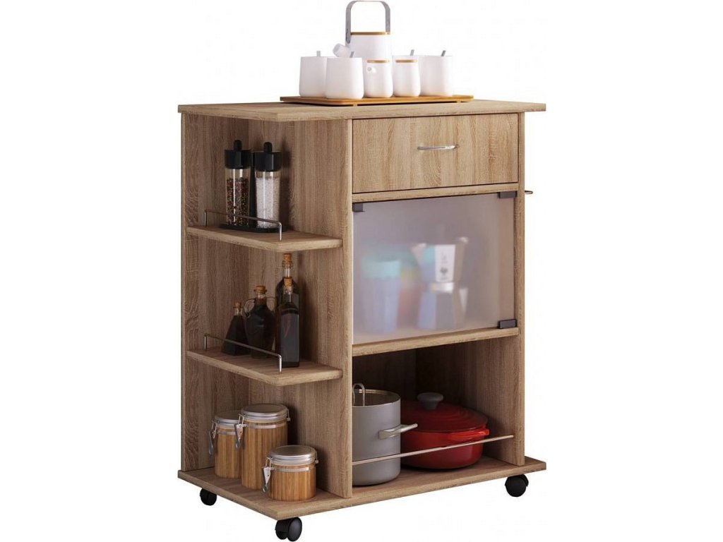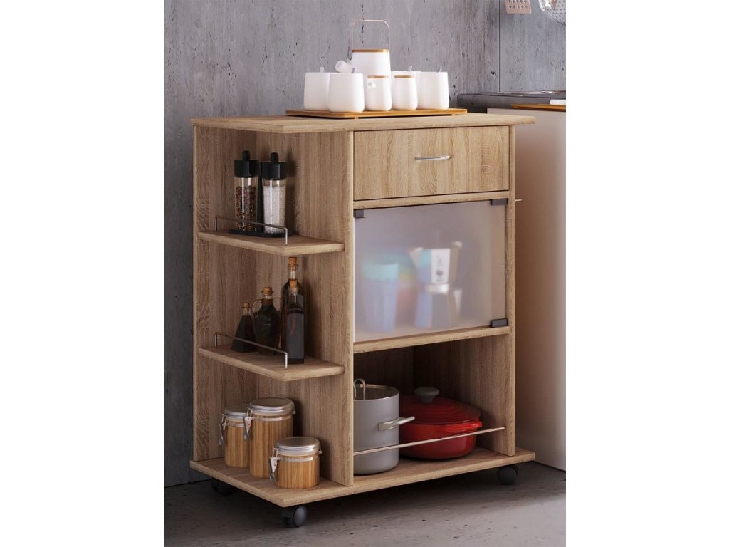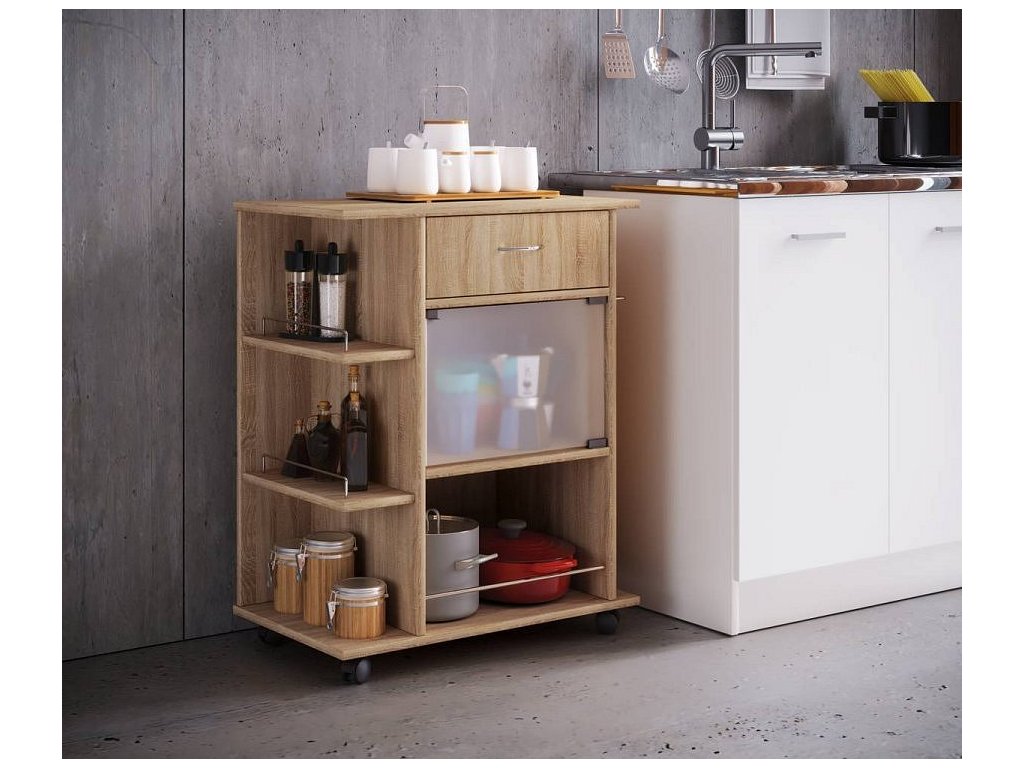 Kuchyňský vozík na kolečkách VCM Pocis je ideální pomocník do moderní kuchyně. Nabízí kombinaci stylového designu a praktického úložného prostoru, který udrží vše přehledně uspořádané. Povrch s ochrannou úpravou se snadno čistí a je odolný vůči vlhkosti, takže vozík dlouho vydrží krásný i funkční.