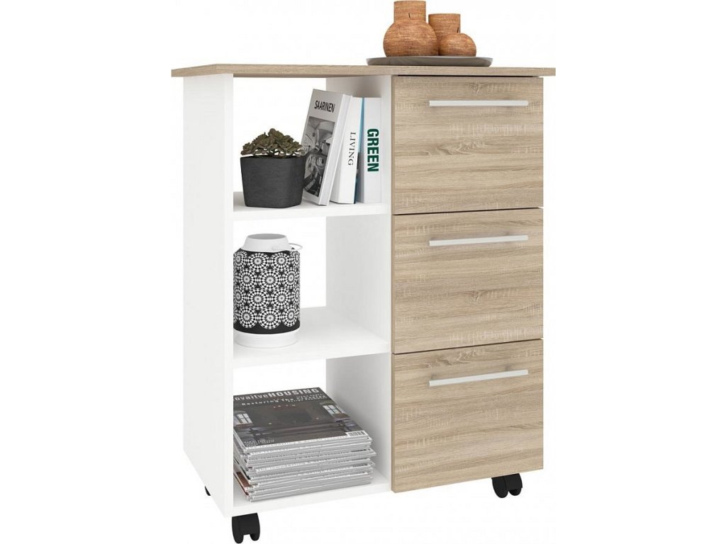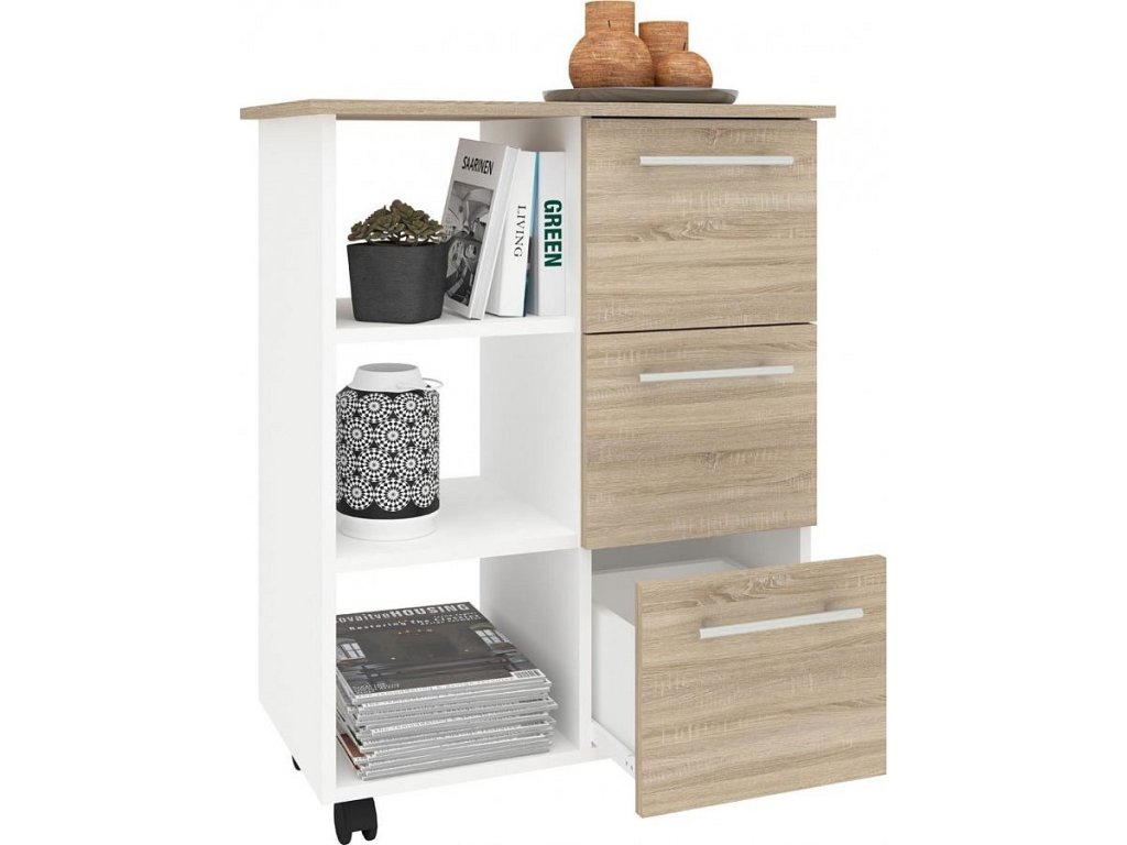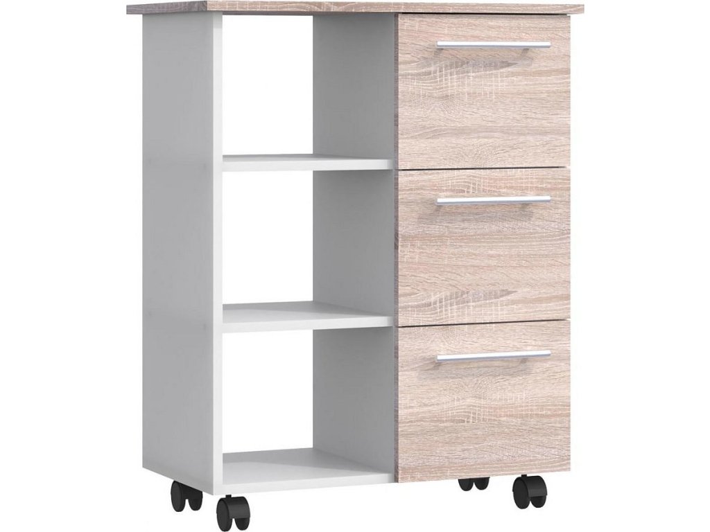 Praktický a prostorný kuchyňský vozík v provedení sonoma dub zajistí ve vaší kuchyni ještě více úložného místa. Má odolnou horní desku, 3 velké šuplíky a 3 otevřené přihrádky se spoustou prostoru.
