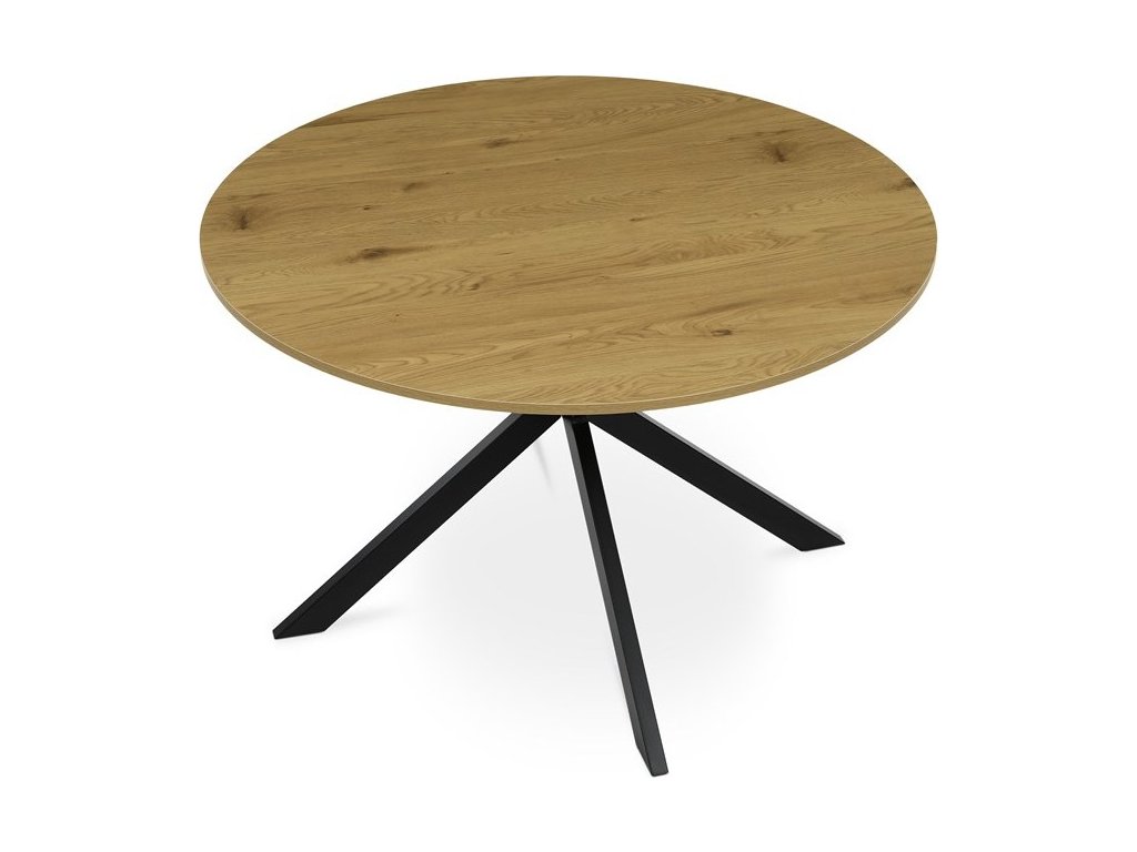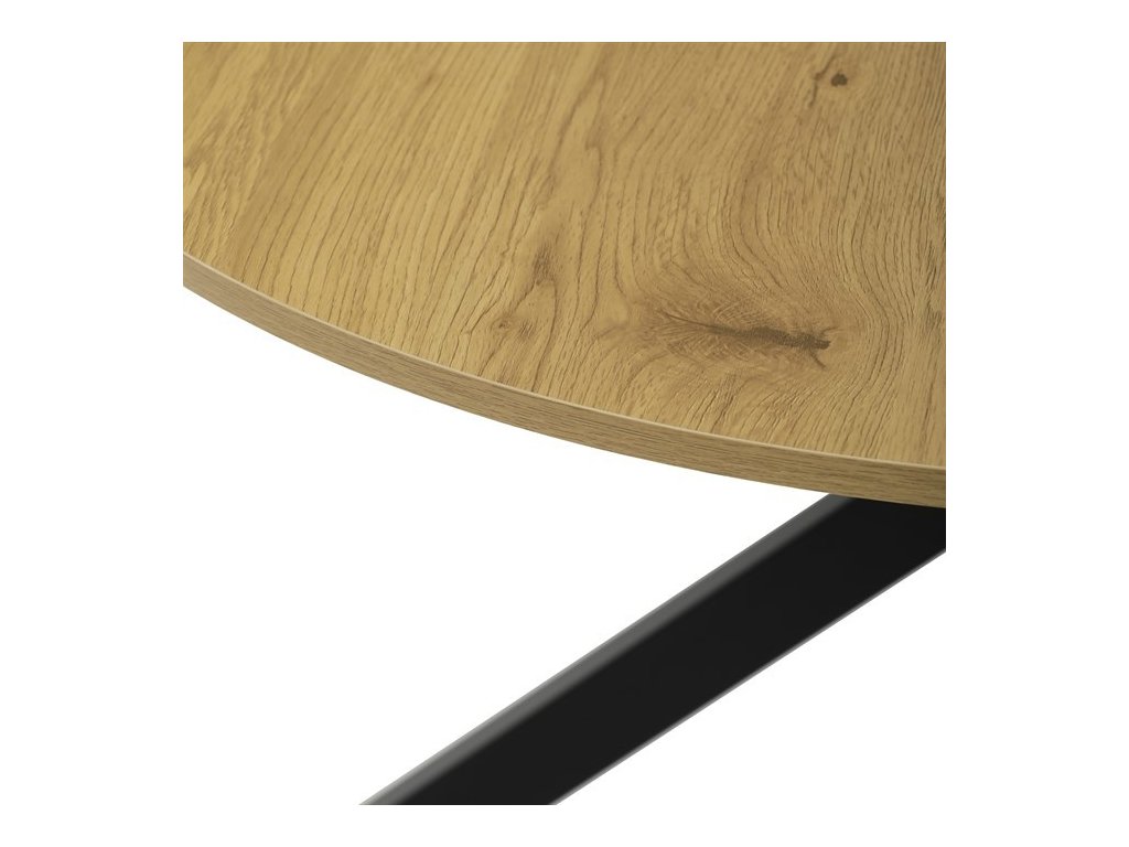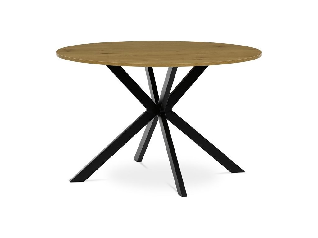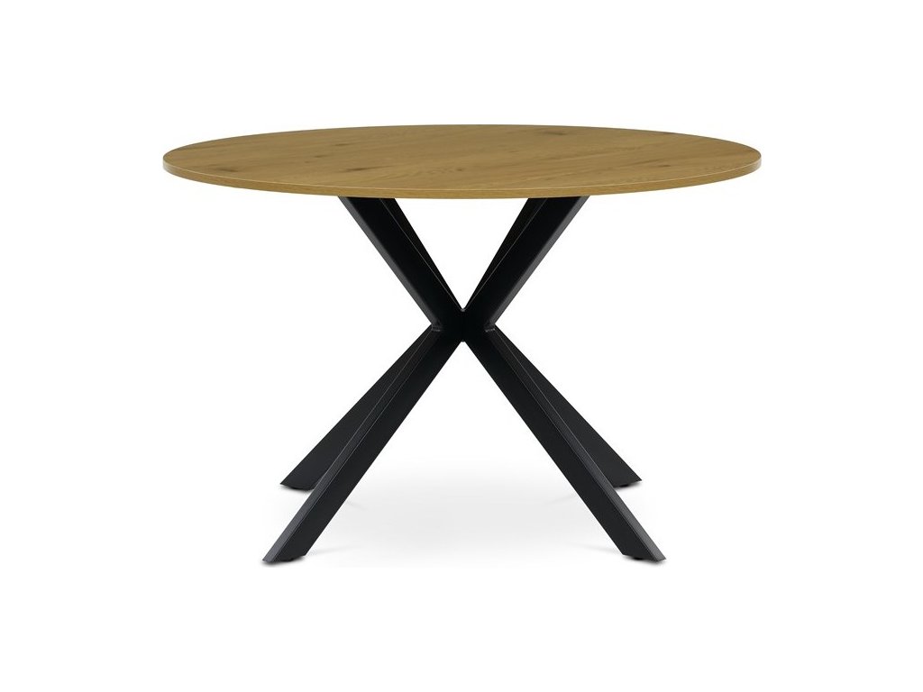 Jídelní kulatý stůl HT-F4120 OAK značky Autronic vyniká kombinací přírodního dekoru divokého dubu a robustní konstrukce s černými kovovými nohami. Deska stolu je vyrobena z MDF materiálu s tloušťkou optimalizovanou pro odolnost a stabilitu, opatřená ABS hranou, která chrání okraje před poškozením a zajišťuje dlouhou životnost. Kovová podnož je tvořena čtyřmi širokými nohami uspořádanými do kříže, což zajišťuje vysokou pevnost a stabilitu celé konstrukce, přičemž povrch nohou je upraven práškovým lakem pro zvýšení odolnosti proti korozi a mechanickému opotřebení. Praktickou vlastností jsou rektifikační nohy umožňující vyrovnání stolu na nerovném povrchu, což zvyšuje komfort používání a zabraňuje kývání. Kulatý tvar desky podporuje rovnoměrné rozložení prostoru pro sezení a usnadňuje komunikaci mezi uživateli, což ocení zejména v jídelních prostorách. Stůl je vhodný pro domácnosti i komerční provozy, kde je kladen důraz na kombinaci estetického vzhledu a funkčnosti. Rozměry 120 cm v průměru a výška 75 cm poskytují dostatek prostoru pro pohodlné stolování, přičemž nosnost konstrukce odpovídá běžným požadavkům na jídelní nábytek.