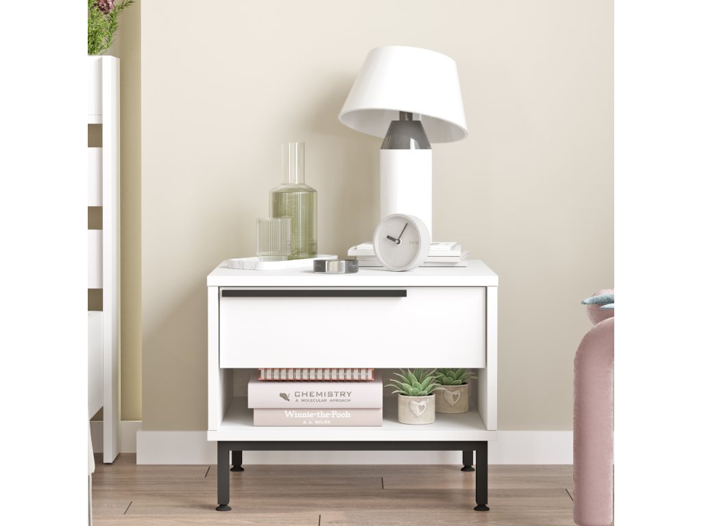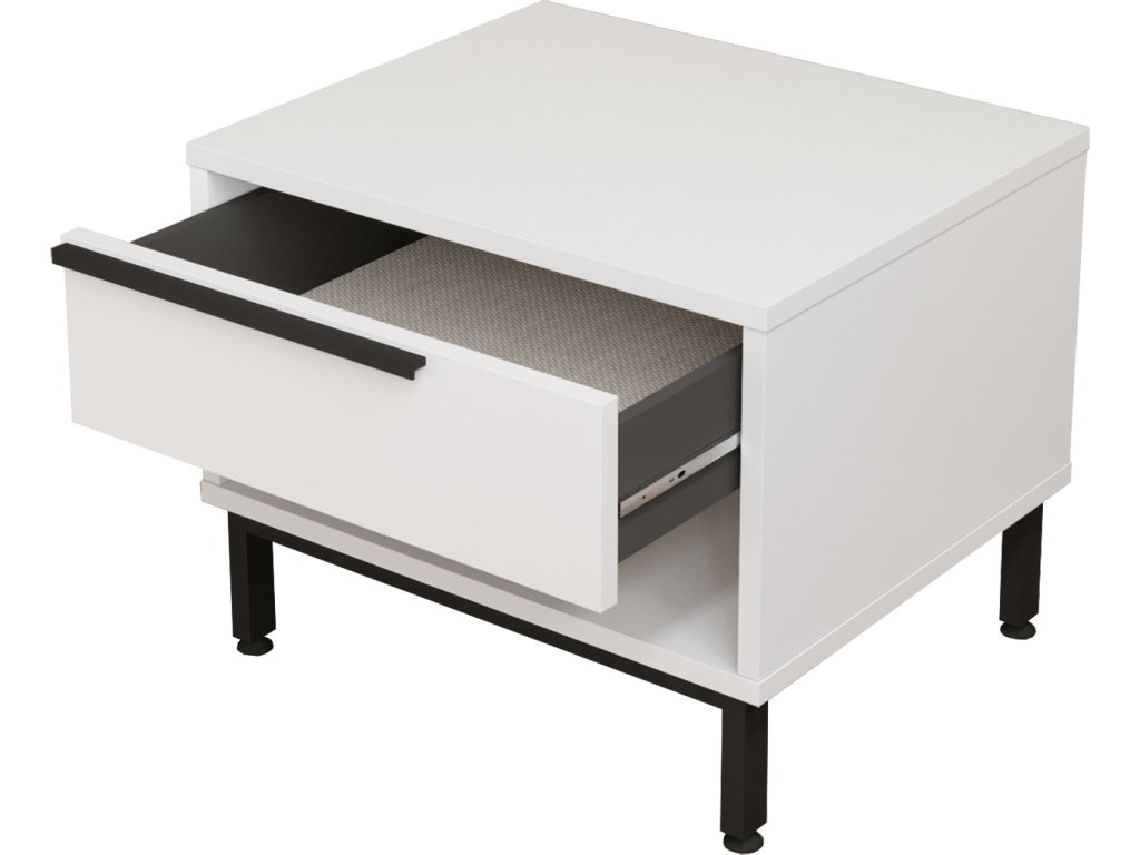 Noční stolek je ideálním doplňkem do moderní ložnice. Spojení kvalitního LTD materiálu a kovu zajišťuje odolnost a atraktivní vzhled. Díky kompaktním rozměrům, jedné zásuvce a regálku nabízí stolek dostatek úložného prostoru pro vaše nezbytnosti a snadno zapadne do jakéhokoli interiéru.