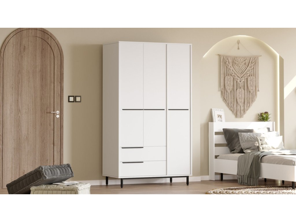 kombinuje praktičnost a elegantní design. Tři dveře skrývají prostor s šatní tyčí pro zavěšení oblečení, zatímco dvě zásuvky a čtyři police poskytují úložné místo pro složené oděvy, doplňky nebo ložní prádlo. Díky promyšlenému uspořádání je tato skříň ideálním řešením pro organizaci a přehlednost.
