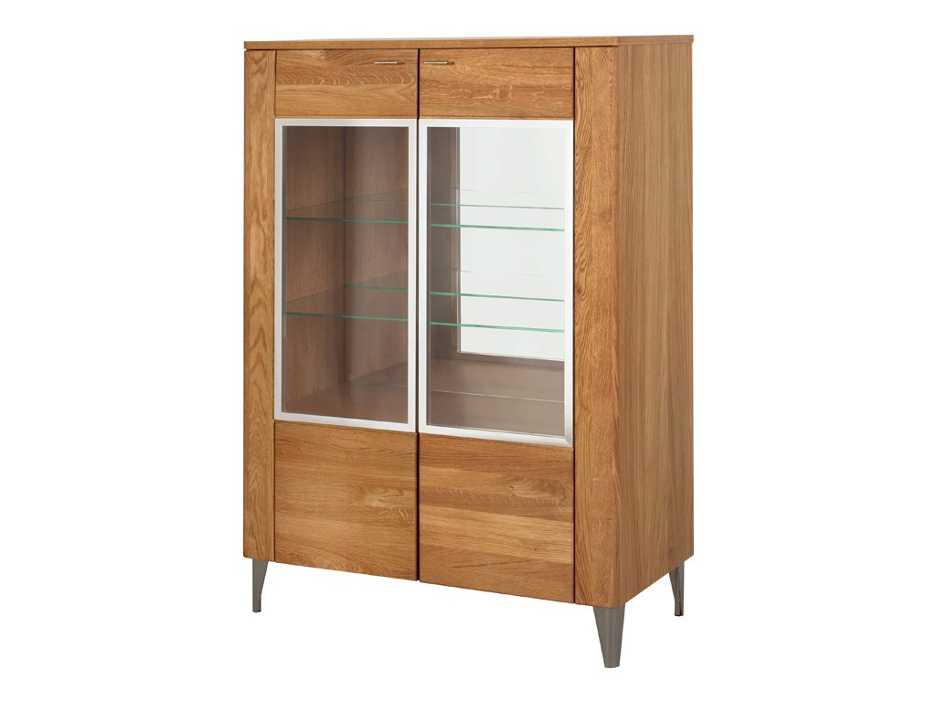 Korpus vitríny je vyroben z přírodní dýhy. Přední část je vyrobena z masivu dubového dřeva. Úchyty jsou pochromované, ve stříbrné barvě. Barevné provedení: dub medový. Disponuje vysokými elegantními nožičkami.