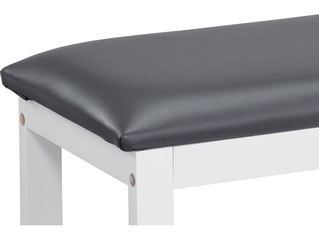 Botník s taburetem kombinuje praktické uspořádání s pohodlným posezením díky polstrovanému sedáku potaženému šedou ekokůží. Masivní rám z kaučukovníku v bílé barvě je doplněn o dvě chromované police, které nabízejí dostatek prostoru pro uložení obuvi. Pevné provedení zajišťuje stabilitu a dlouhou životnost, zatímco jednoduchý design umožňuje snadné začlenění do různých interiérů. Výška a rozměry taburetu jsou přizpůsobeny pro pohodlné sezení i praktické využití v předsíni či chodbě.