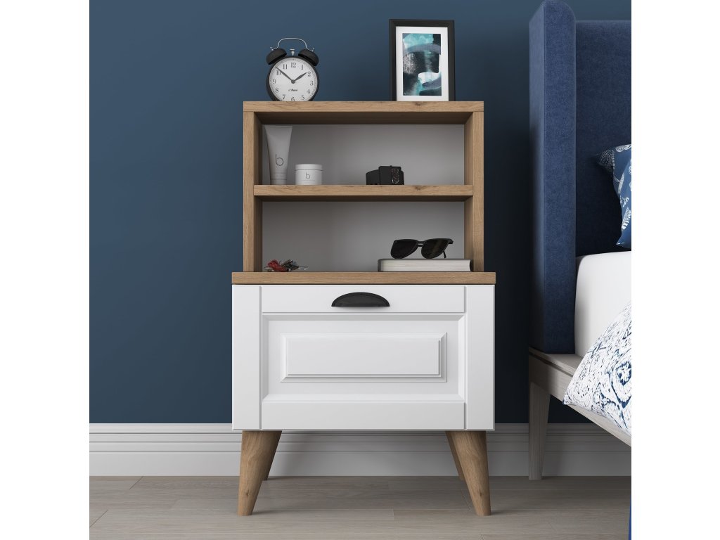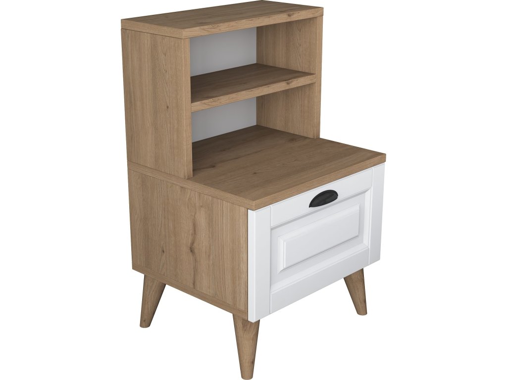 Noční stolek je dokonalým spojením elegance a funkčnosti. Kombinace bílé barvy a dekoru ořechu dodává ložnici moderní a útulný vzhled, zatímco praktické uspořádání zásuvky a regálku poskytuje dostatek místa pro vaše nezbytnosti.