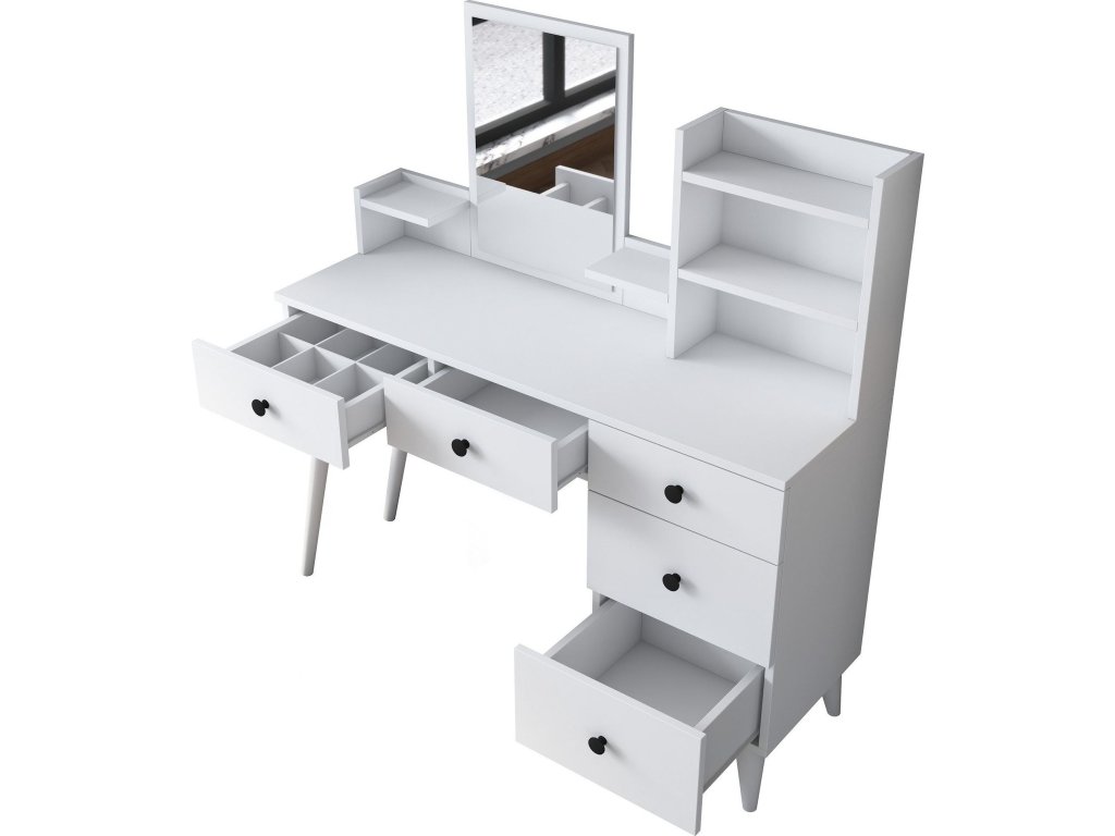 Toaletní stolek je ideálním doplňkem pro moderní ložnici. Kombinuje funkčnost a minimalistický skandinávský design, který podtrhuje jeho čistě bílá barva. Díky zrcadlu, zásuvkám a regálku nabízí praktické a stylové místo pro vaši každodenní péči.