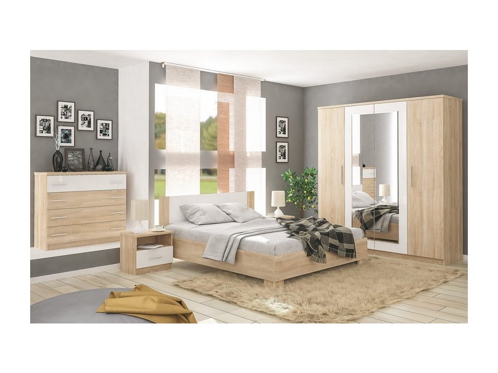 CASA 97004 Sestava do ložnice ze sektorového nábytku v moderním provedení v jemných barvách dokonale doplní Váš interiér. Nábytek je vyroben z kvalitní LTD desky v barevné kombinaci dub sonoma / bílá. Nabídka komponentů této sektorové řady umožňuje sestavit si nábytek do ložnice nebo studentského pokoje dle vlastních představ. Sestava se skládá z (š/v/hl): postel s roštem (166,4 x 85,2 x 203,6 cm), 2 kusy nočního stolku (51 x 45,6 x 37,2 cm ), komody se 4 zásuvkami (102,8 x 92,2 x 40 cm) a šatní skříně čtyřdveřové (200,8 x 214 x 58 cm). V ceně není zahrnuta matrace, možno dokoupit, vhodný rozměr 160 x 200 cm nebo 2 ks 80 x 200 cm. Dodáváme v demontovaném stavu.