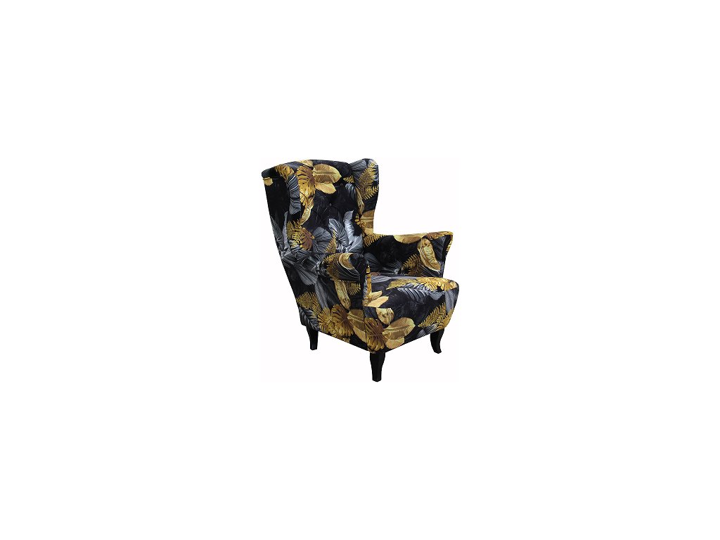 LUDWIG -křeslo ,látka KA12617-vzor černá-šedožluté listy listy/nohy wenge kolekce - "E" (FE) (K250-E)