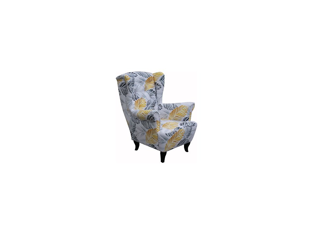 LUDWIG -křeslo ,látka KA12634-vzor sv.šedá-šedožluté listy/nohy wenge kolekce - "E" (FE) (K250-E)