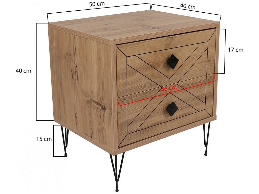 Se dvěma prostornými zásuvkami nabízí tento noční stolek dostatek úložného prostoru pro všechny vaše nezbytnosti před spaním. Délka zásuvky 46 cm a výška zásuvky 17 cm poskytují dostatek prostoru pro uložení vašich věcí uspořádaných a na dosah ruky. Rozlučte se s přeplněnými povrchy a pozdravte uklizenou a organizovanou ložnici.