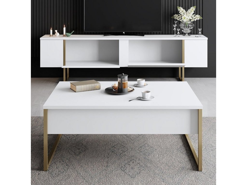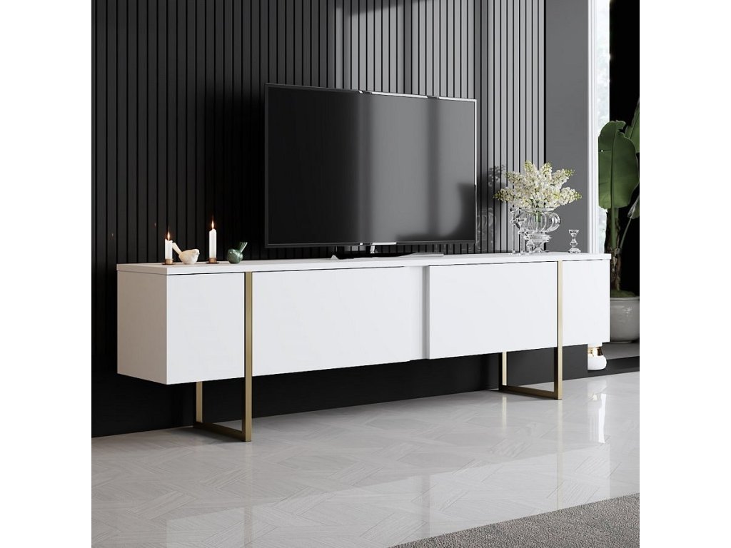 Začlenění kovových nohou dodává tomuto již tak nádhernému televiznímu stolku nádech elegance a sofistikovanosti. Elegantní zlatá povrchová úprava dokonale doplňuje bílou barvu a vytváří ohromující vizuální kontrast, který okamžitě upoutá pozornost každého, kdo vstoupí do vašeho obývacího prostoru.