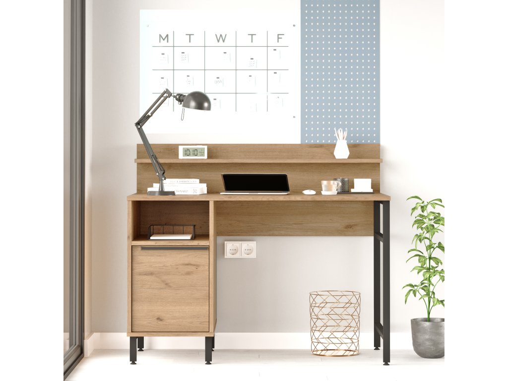 kombinuje funkčnost a styl. Regálek a odkládací police poskytují prostor pro knihy, učebnice nebo dekorace, zatímco plné dvířko skrývá úložný prostor pro drobnosti, které chcete mít uspořádané. Díky svým rozměrům je stůl vhodný jak pro studium, tak pro práci, a přitom se snadno vejde i do menších místností.