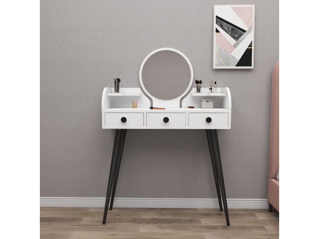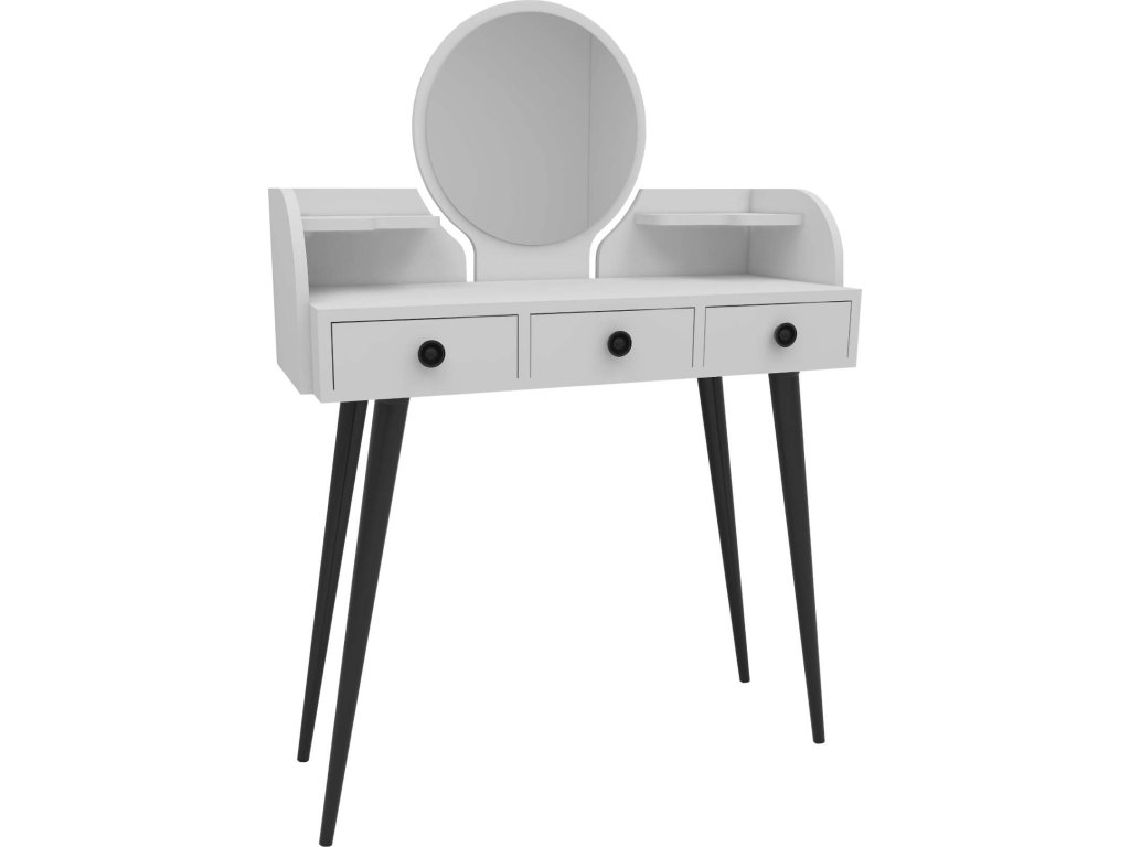 Toaletní stolek kombinuje stylový design a funkčnost, díky čemuž je ideálním řešením pro každou moderní ložnici. Tento vysoký stolek je vybaven třemi zásuvkami, regálkem a zrcadlem, což poskytuje dostatek prostoru pro uložení kosmetiky, doplňků a dalších nezbytností.