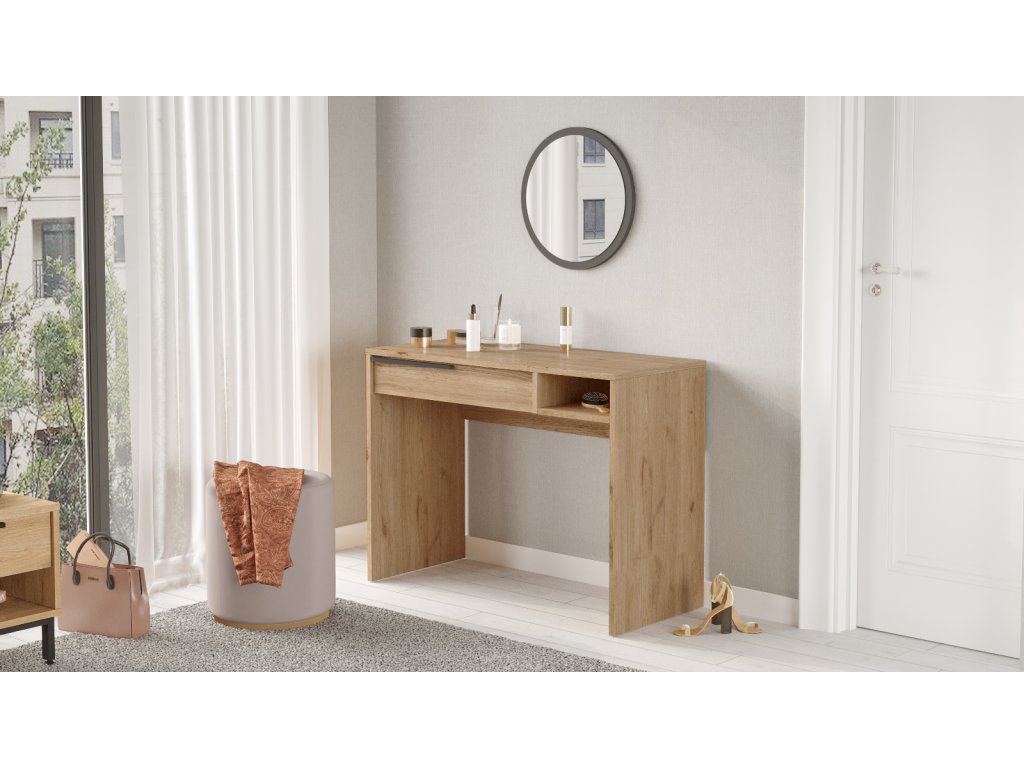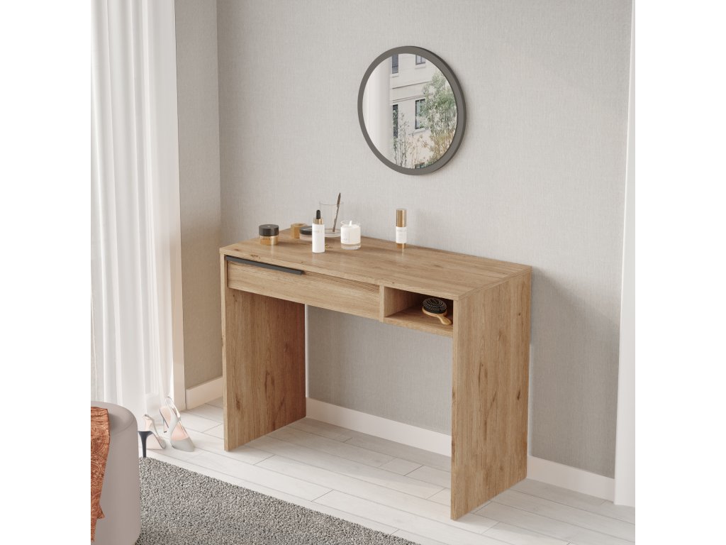Toaletní stolek je perfektním doplňkem pro moderní ložnici. Vyrobený z kvalitního LTD materiálu nabízí odolnost, dlouhou životnost a stylový vzhled. Díky vybavení, které zahrnuje jednu zásuvku, regálek a kulaté zrcadlo, přináší tento stolek praktičnost a estetiku v jednom.