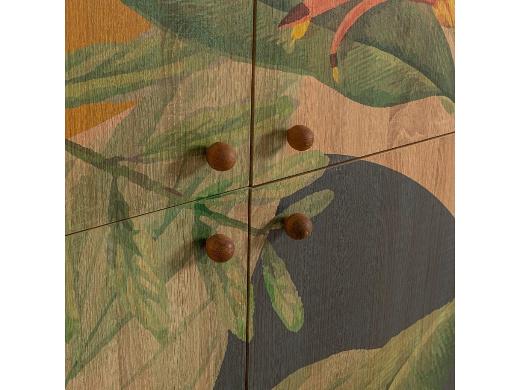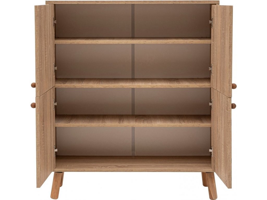 Tato skříňka je vyrobena ze 100% dřevotřísky s melaminovým povlakem a je navržena tak, aby vydržela. Tloušťka 18 mm zajišťuje robustnost a stabilitu, zatímco dřevěné nohy dodávají nádech sofistikovanosti. UV lak nejen umocňuje krásu skříňky, ale také ji chrání před poškrábáním a vyblednutím.