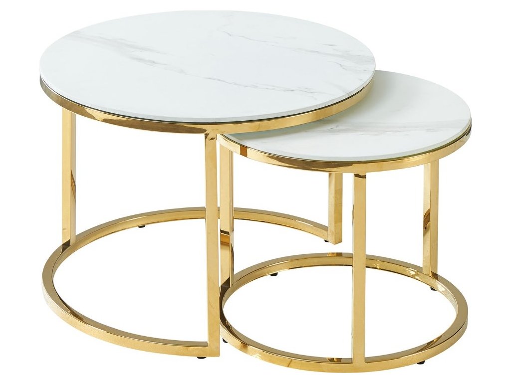 Konferenční stolky jsou vyrobeny z tvrzeného skla v bílé barvě, s efektem mramoru. Konstrukce je vyrobena z nerezavějící oceli ve zlatém barevném provedení.