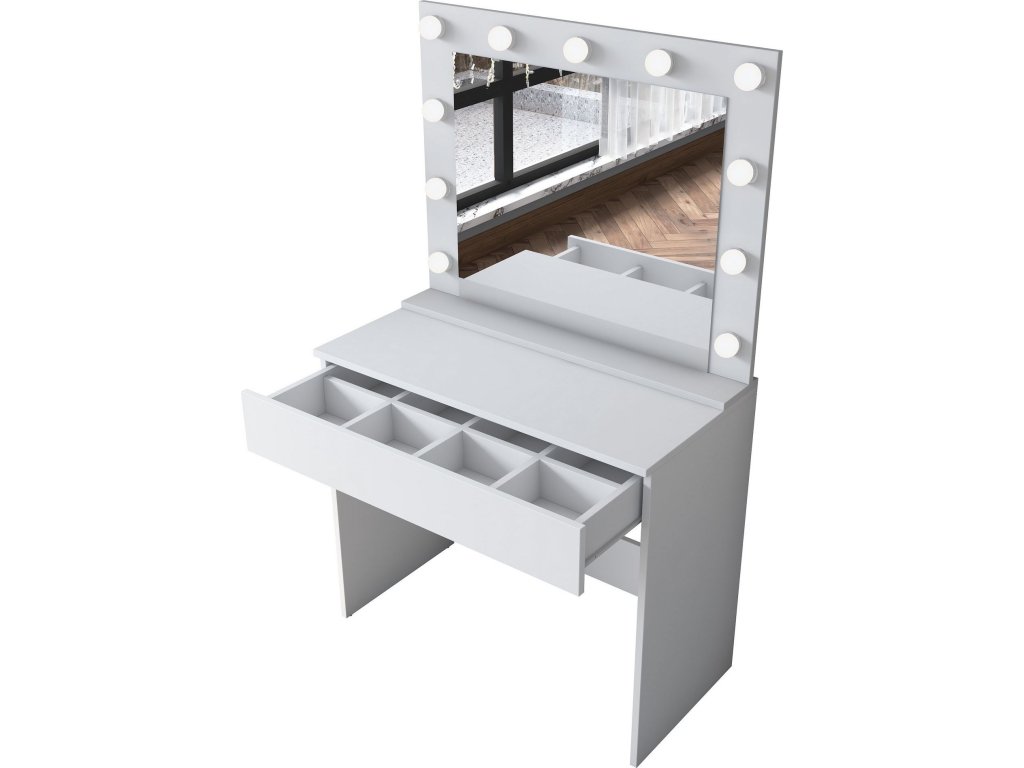 Toaletní stolek je vybaven prostornou zásuvkou, která poskytuje dostatek místa pro uložení kosmetiky, šperků nebo jiných drobností. Velké zrcadlo zajišťuje komfortní prostor pro každodenní péči o váš vzhled.