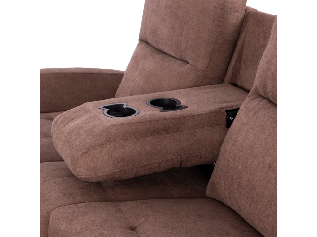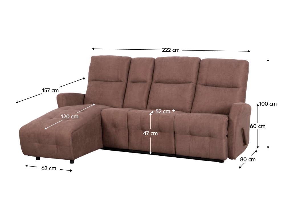 Materiál: látka/kov Oděruodolnost textilie podle testu Martindale: 20 000 oděrů Barva: hnědá Rozměry (ŠxHxV): 222x80x100 cm Výška sedu: 47 cm Hloubka sedu: 52 cm Výška područky: 60 cm Hloubka otomanu: 120 cm Šířka otomanu: 62 cm Nosnost: 100 kg Výplň: pružina falista+Pur pěna Levé provedení Rohová Celočalouněná Nastavitelná S funkcí polohování pravé strany Mechanické polohování Podnož vysunete pomocí páčky Sklápěcí držák na občerstvení Dodáváno v demontu