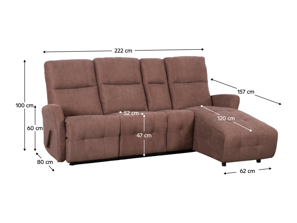 Materiál: látka/kov Oděruodolnost textilie podle testu Martindale: 20 000 oděrů Barva: hnědá Rozměry (ŠxHxV): 222x80x100 cm Výška sedu: 47 cm Hloubka sedu: 52 cm Výška područky: 60 cm Hloubka otomanu: 120 cm Šířka otomanu: 62 cm Nosnost: 100 kg Výplň: pružina falista+Pur pěna Pravé provedení Rohová Celočalouněná Nastavitelná S funkcí polohování levé strany Mechanické polohování Podnož vysunete pomocí páčky Sklápěcí držák na občerstvení Dodáváno v demontu