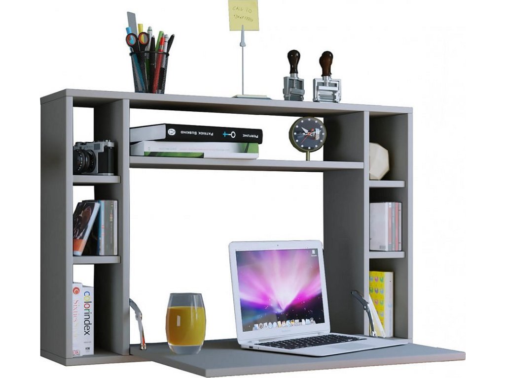 Ve věku notebooků a tabletů je vhodný nábytek potřebný. Nástěnná police se jediným pohybem transformuje na malé kancelářské pracoviště, které nabízí dostatek prostoru pro práci.