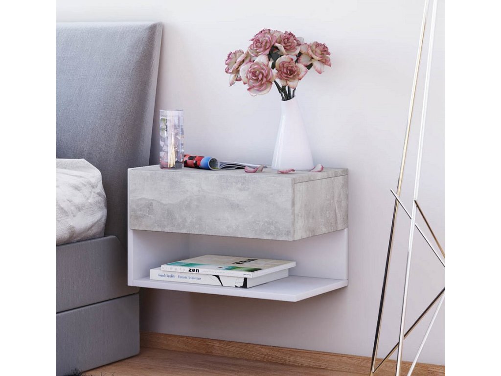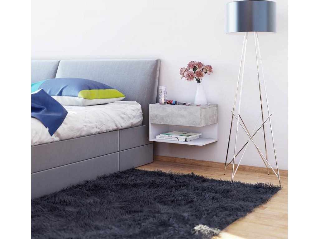 Nástěnný noční stolek s hladkou zásuvkou, který poskytne praktický úložný prostor. Otevřenou polici lze umísit vpravo i vlevo. Určeny jsou zejména jako stolky k posteli, ale můžete využít i kdekoliv jinde v interiéru jako zajímavou skříňku.