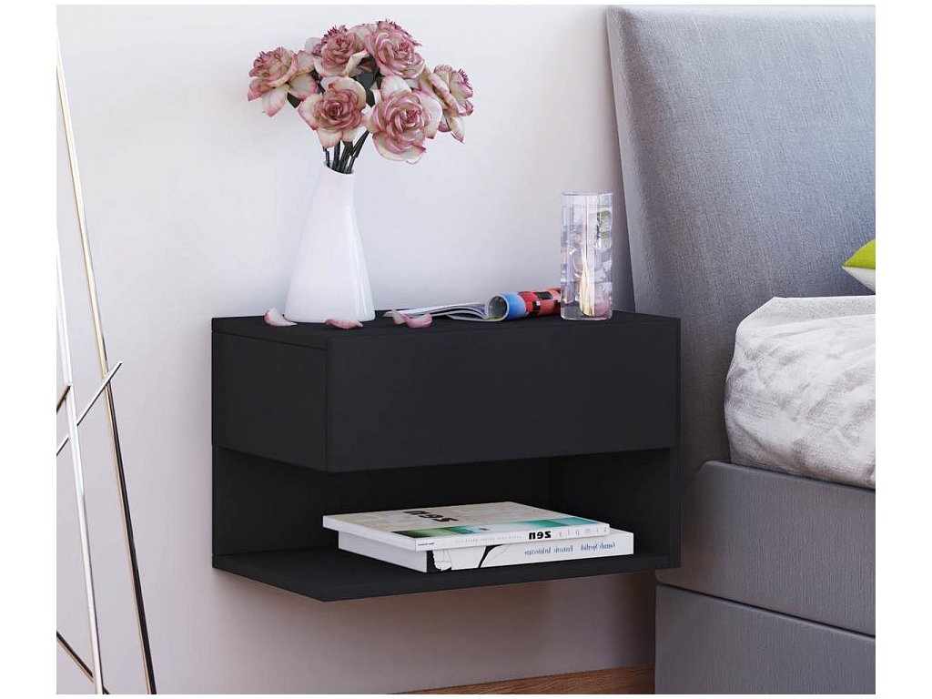 Nástěnný noční stolek s hladkou zásuvkou, který poskytne praktický úložný prostor. Otevřenou polici lze umísit vpravo i vlevo. Určeny jsou zejména jako stolky k posteli, ale můžete využít i kdekoliv jinde v interiéru jako zajímavou skříňku.