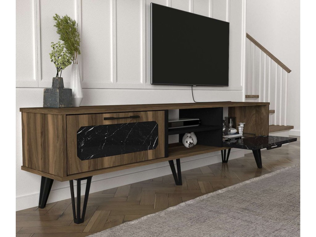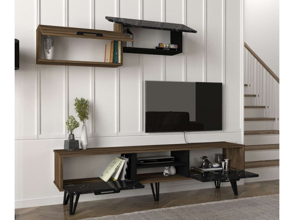 - Rozměry: TV stolek (180 x 35 x 50.8 cm) a nástěnná police (132 x 23.8 x 41.8 cm) poskytují bohatý prostor pro vaši multimediální techniku a dekorace.