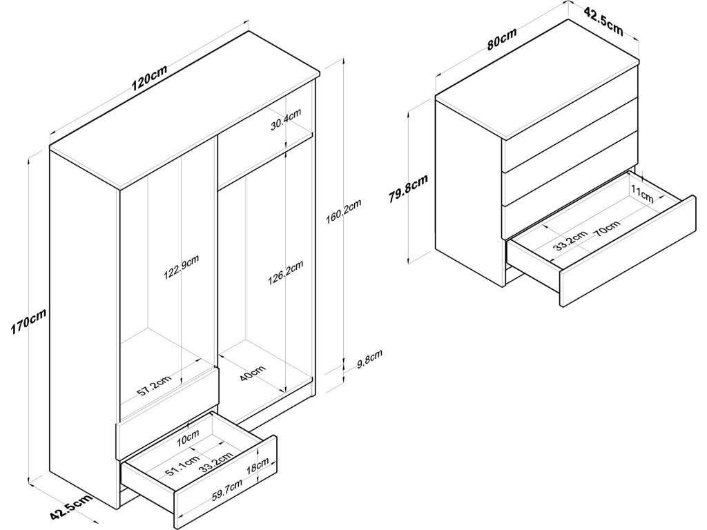 Sestava obsahuje šatní skříň s dostatkem prostoru pro zavěšení oblečení a šuplíkovou komodu, která nabízí 6 zásuvek pro organizaci ložního prádla, oblečení nebo doplňků. Tento praktický a estetický set zajistí pořádek a přehlednost ve vaší ložnici.