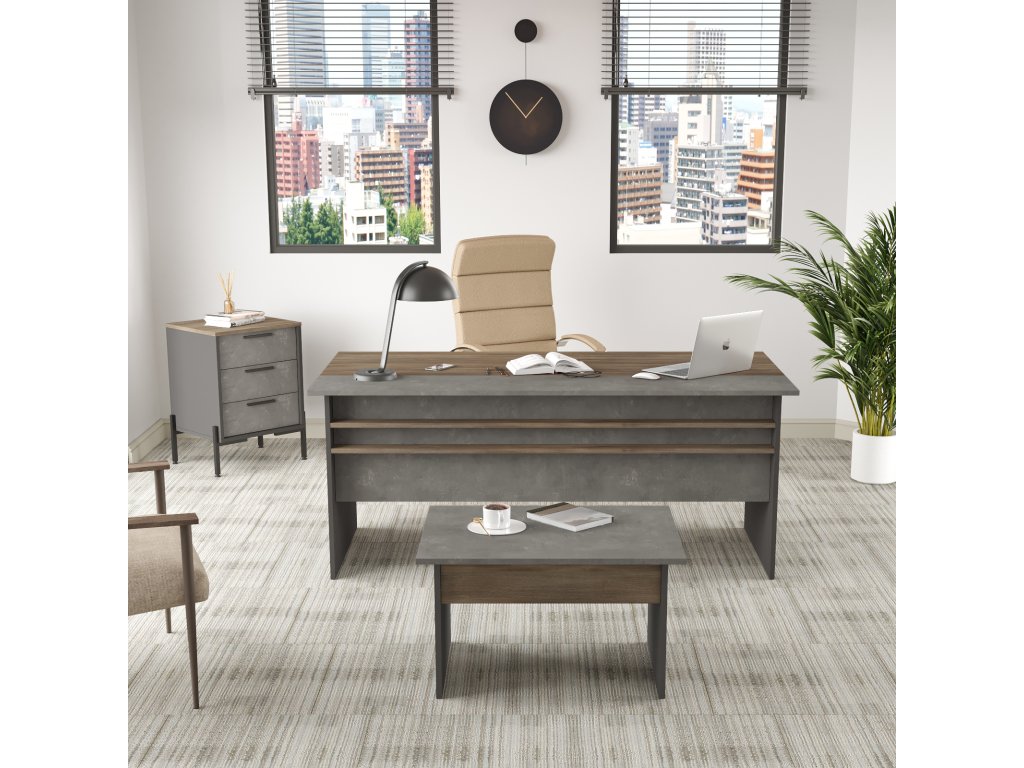 kombinuje praktičnost a elegantní design. Prostorný psací stůl poskytuje dostatek místa pro práci, konferenční stolek je ideální pro jednání, odkládání dokumentů nebo relaxaci. Malá komoda nabízí další úložný prostor pro kancelářské potřeby a pomáhá udržovat pracovní prostor přehledný. Tato sestava je perfektní volbou pro moderní pracovní prostředí.