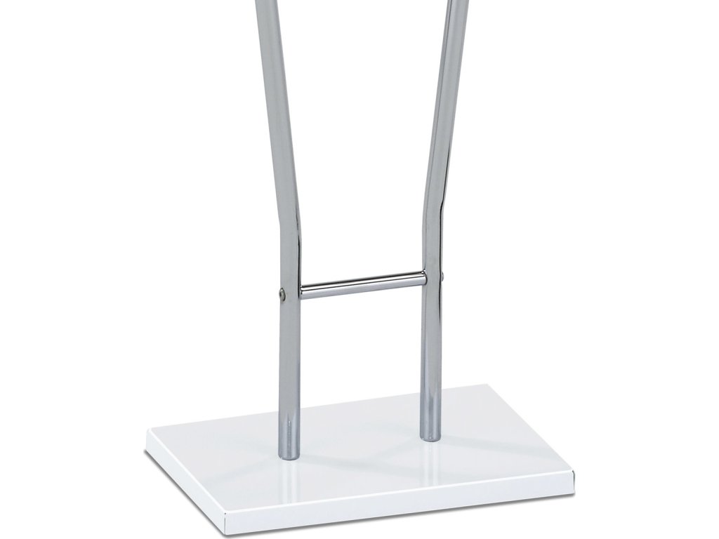 Praktický němý sluha v moderním designu. Konstrukce je kombinací kovových trubek s kovovou podestou a masivního ramene. Povrchová úprava je v bílém matném laku a chromu. Výška 110 cm Vám umožní zavěšení oblečení i doplňků bez pomačkání. Nosnost stojanu je až 6 kg, hmotnost necelé 4 kg. Proto je jednoduše přenositelný a lze ho umístit podle momentální potřeby i nálady. Stylem a jednoduchostí se hodí do jakéhokoli interiéru. Využití je nepřeberné, záleží jen na Vás.