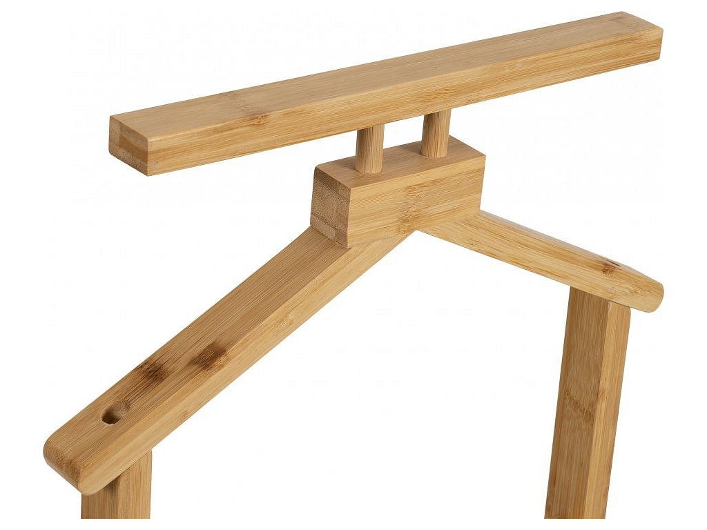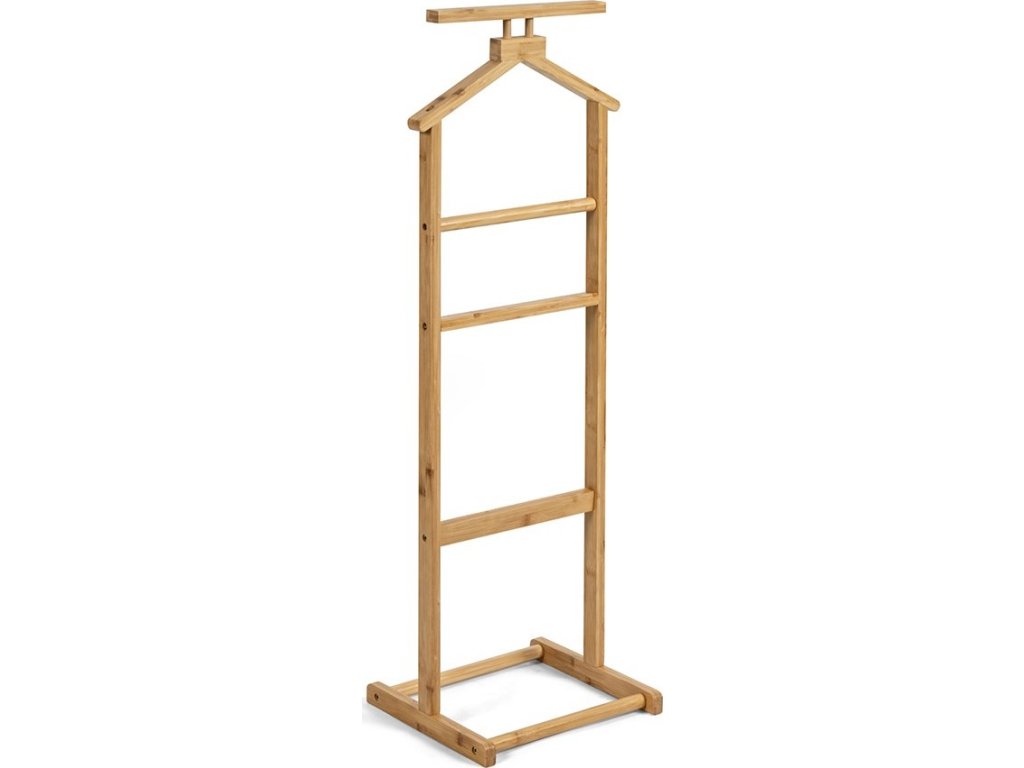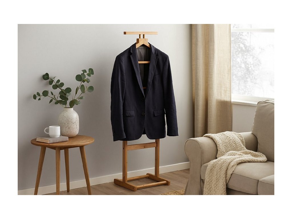 Praktický stojanový věšák na oblečení s nadčasovým designem. Vybavený horním ramínkem na sako či košili a tyčemi na kalhoty či doplňky. Stabilní základna zajišťuje pevnost a odolnost. Ideální do ložnice, šatny nebo předsíně. Spojuje funkčnost, jednoduchost a elegantní vzhled.