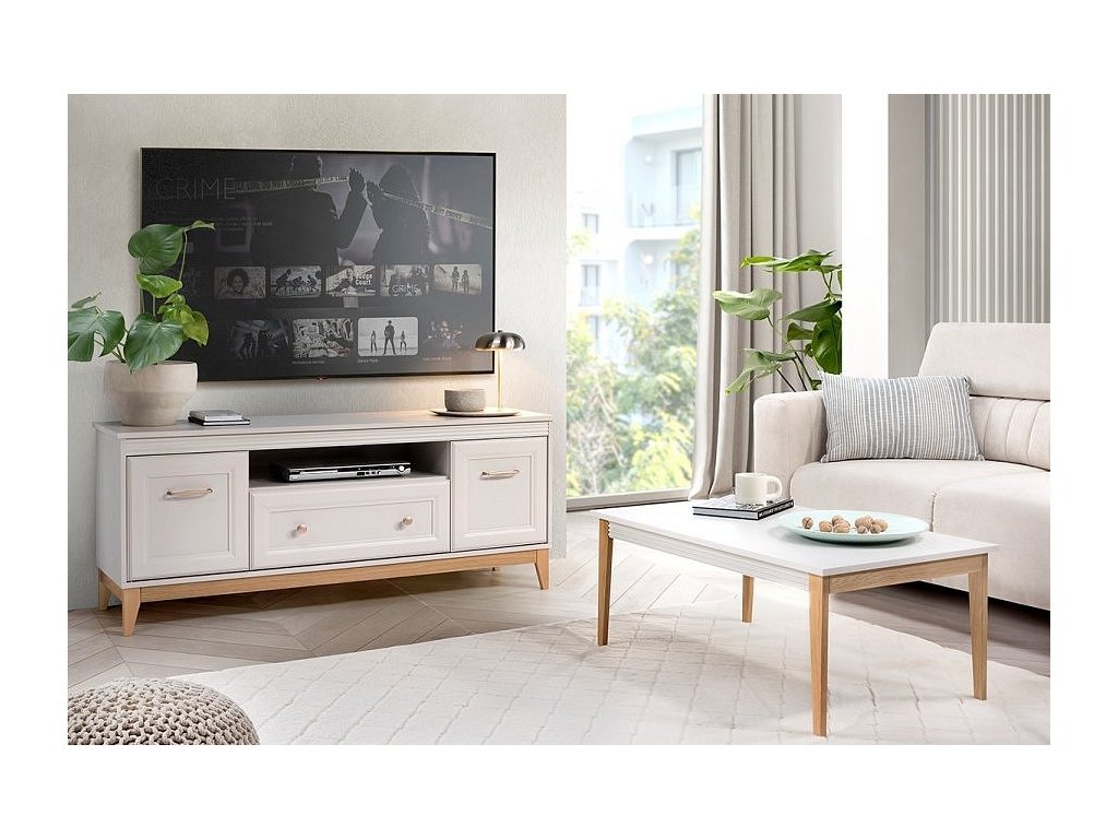 Stolek podepírají nožky z masivního dubového dřeva o výšce 15 cm, které jsou pevné a stabilní. Odolné laminované desky u korpusu a MDF deska u frontu (čela) nábytku s ABS hranami přispívají k dlouhé životnosti. Úchyty jsou kovové měděné barvy.
