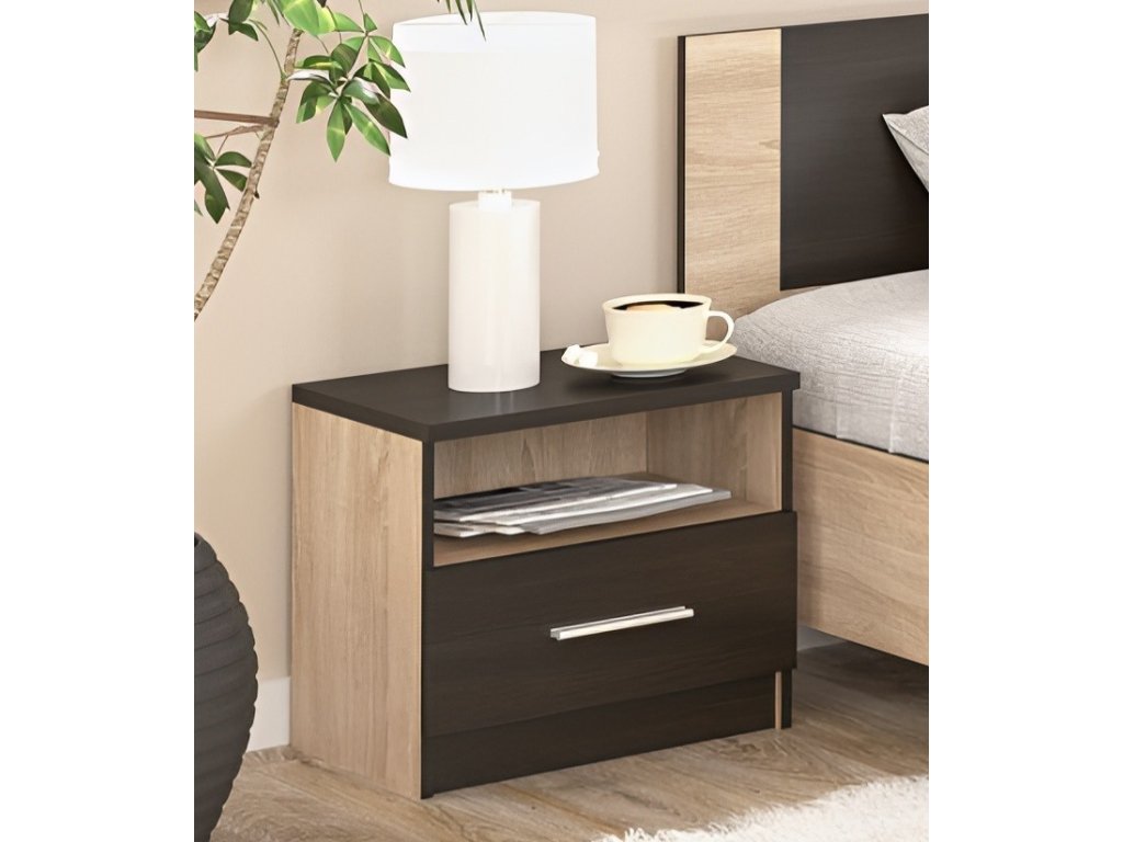 CASA 97003 Noční stolky sada 2 ks z ložnicové řady. Moderní provedení v kontrastních barvách dokonale doplní váš interiér. Noční stolky jsou vyrobeny z kvalitní LTD desky v barevné kombinaci dub sonoma/wenge. Nabídka komponentů této sektorové řady umožňuje sestavit si nábytek do ložnice nebo studentského pokoje dle vlastních představ. Dodáváme v demontovaném stavu.