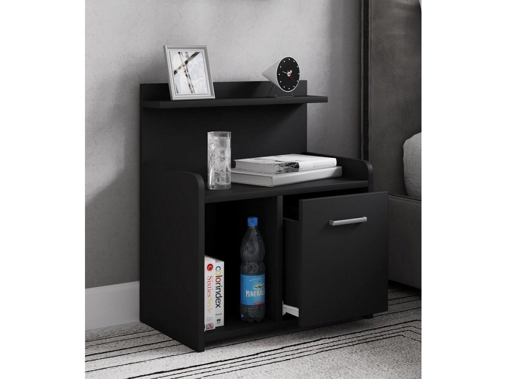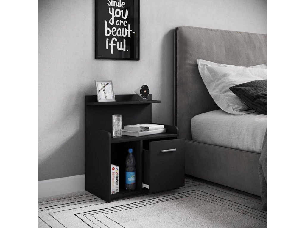 Noční stolek VCM Nilasa přináší funkčnost i styl do každé ložnice. Jako praktický stolek k posteli nabízí lehce výsuvnou zásuvku, jedno velké a dvě menší otevřené přihrádky, takže vše potřebné máte vždy na dosah – knihu, telefon, lampičku i drobnosti.