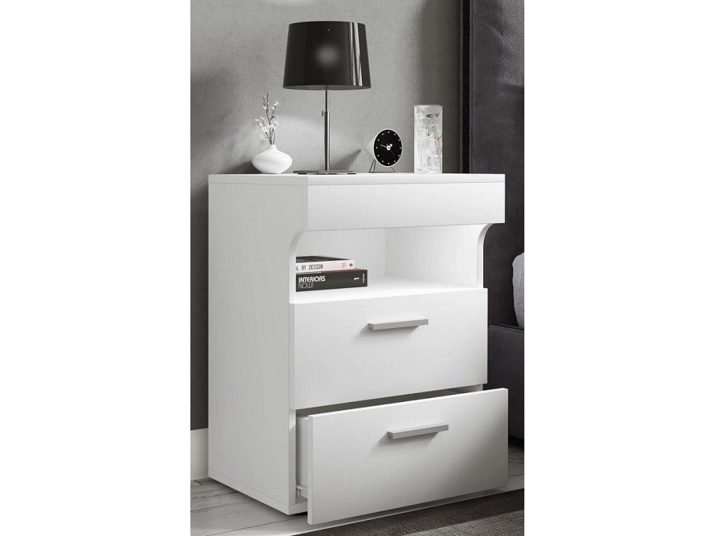 Noční stolek Slepal L je moderní stolek k posteli, který se skvěle hodí jako funkční nábytek do ložnice. Díky propracovanému designu s výrazným čelním panelem působí elegantně a současně prakticky. Dvě plynule výsuvné zásuvky nabízí dostatek úložného prostoru pro předměty, které chcete mít uložené mimo dohled, zatímco horní otevřená přihrádka umožňuje rychlý přístup k tomu, co potřebujete mít po ruce.