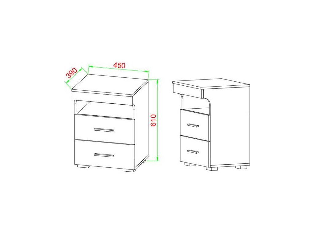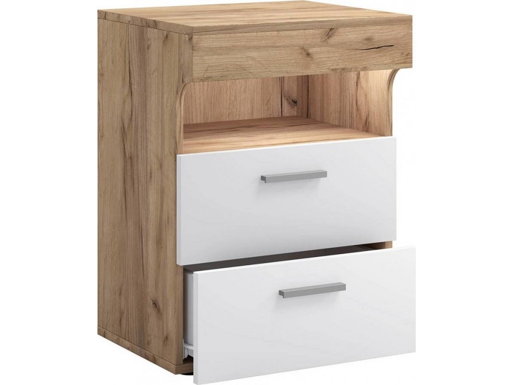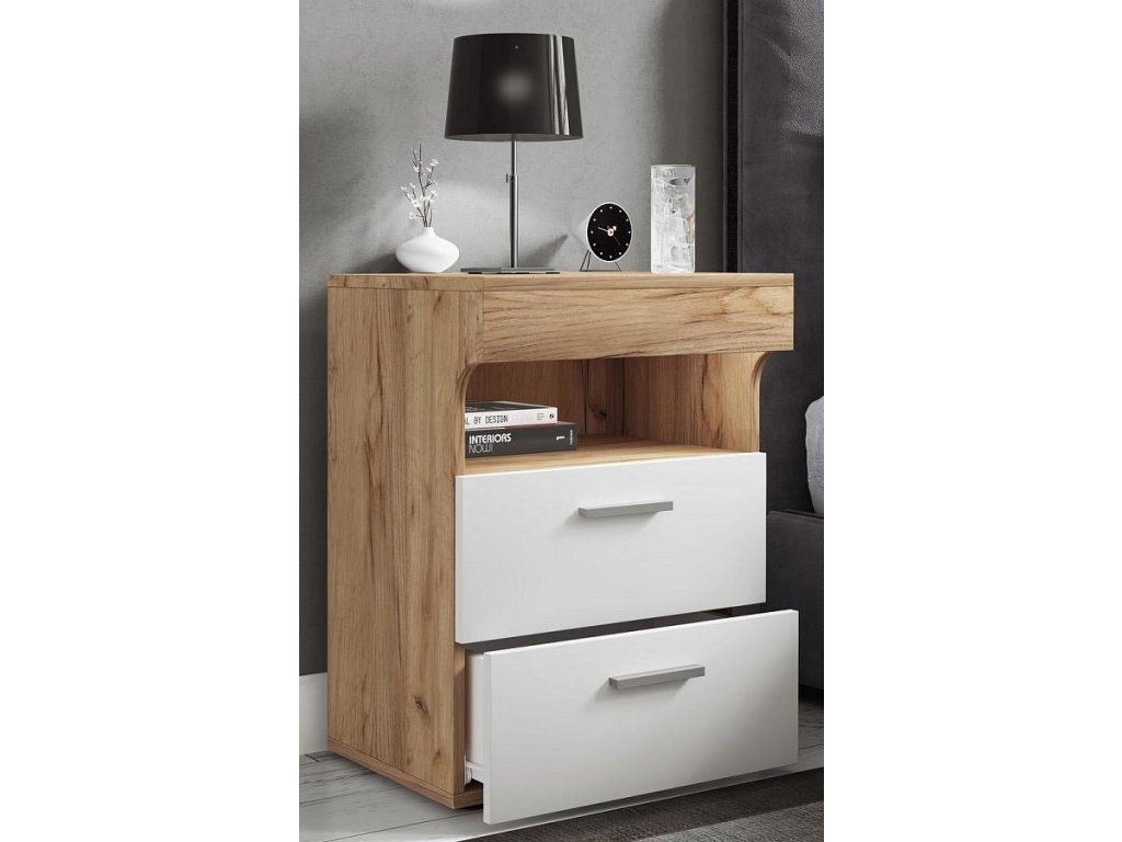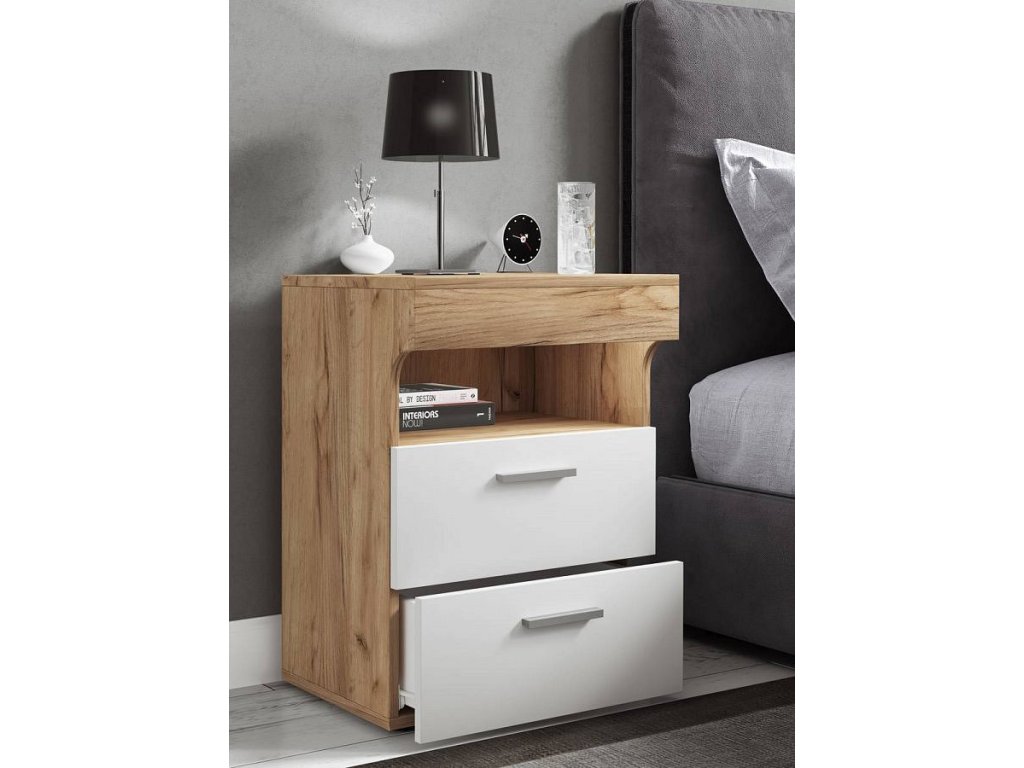 Noční stolek Slepal L je moderní stolek k posteli, který se skvěle hodí jako funkční nábytek do ložnice. Díky propracovanému designu s výrazným čelním panelem působí elegantně a současně prakticky. Dvě plynule výsuvné zásuvky nabízí dostatek úložného prostoru pro předměty, které chcete mít uložené mimo dohled, zatímco horní otevřená přihrádka umožňuje rychlý přístup k tomu, co potřebujete mít po ruce.
