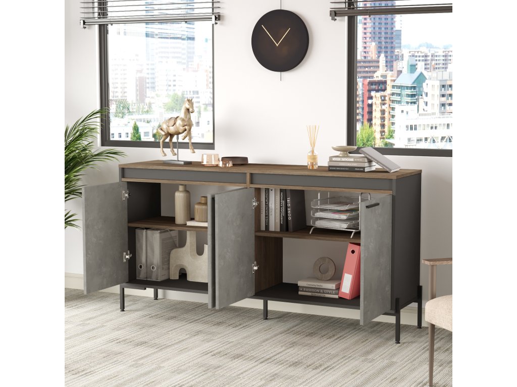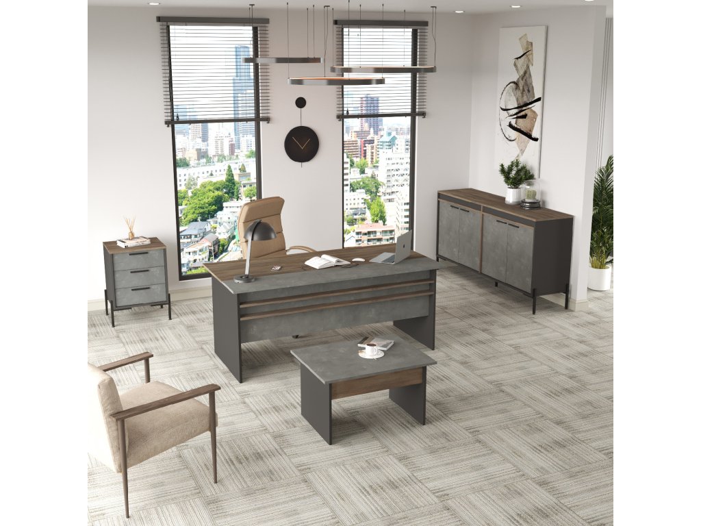 kombinuje funkčnost a moderní design. Prostorný psací stůl poskytuje dostatek místa pro práci na projektech a organizaci dokumentů. Konferenční stolek je ideální pro jednání, relaxaci nebo odkládání materiálů. Malá komoda je perfektním řešením pro kancelářské potřeby, zatímco větší komoda nabízí dostatek úložného prostoru pro šanony, knihy nebo dekorace.
